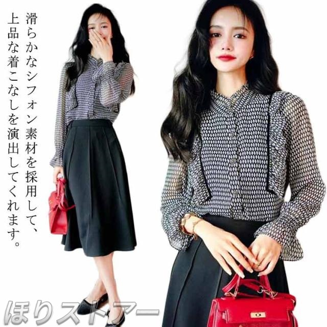 レディース フォーマル ブラウス オフィスブラウス スタンドカラー 長袖ブラウス 春秋新作 シフォン ドット柄トップス 大人 ブラウス オシャレブラウス オフィス 通勤 OL カジュアル きれいめ 可愛い ゆったりシャツ40代20代30代50代