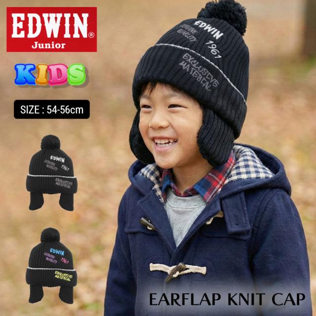EDWIN エドウィン キッズ ジュニア 耳あて付きニットキャップ DW1813 帽子 ニット帽 ブランド ブラック 黒 耳あて 耳当て イヤーフラップ 暖かい 防寒 秋冬 保温 男の子 女の子 おしゃれ かっこいい かわいい プレゼント ギフト