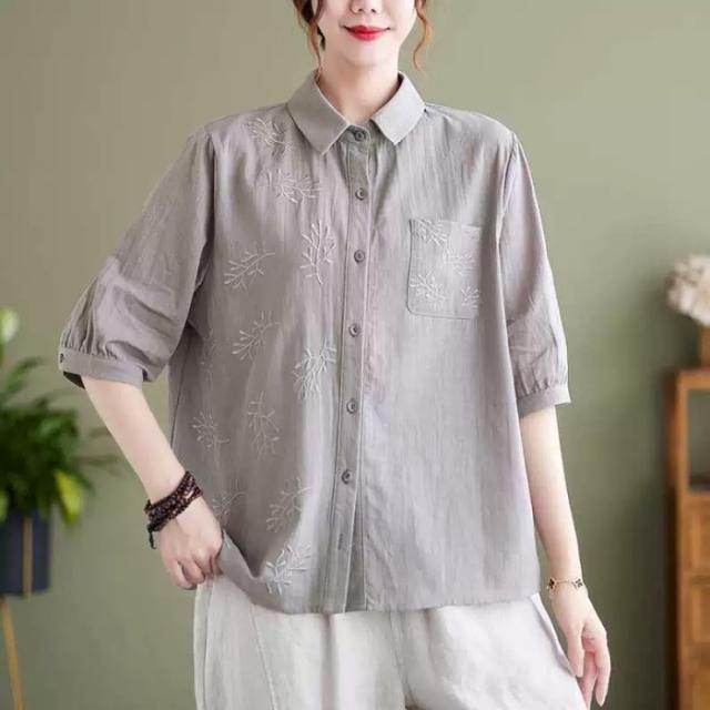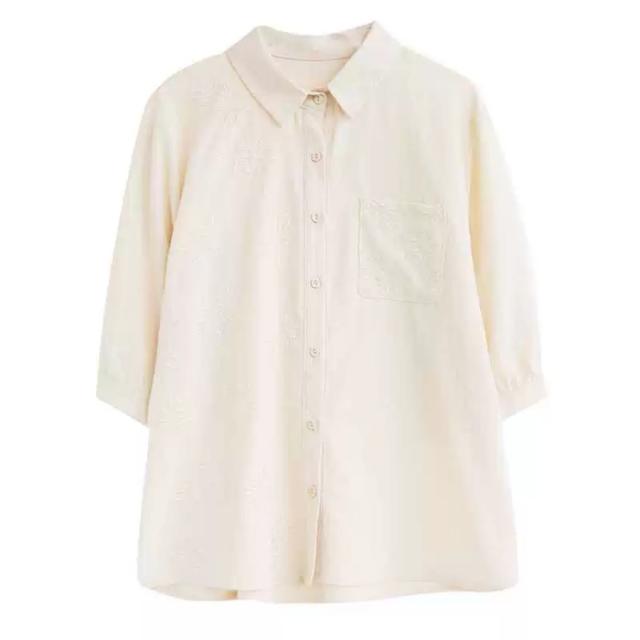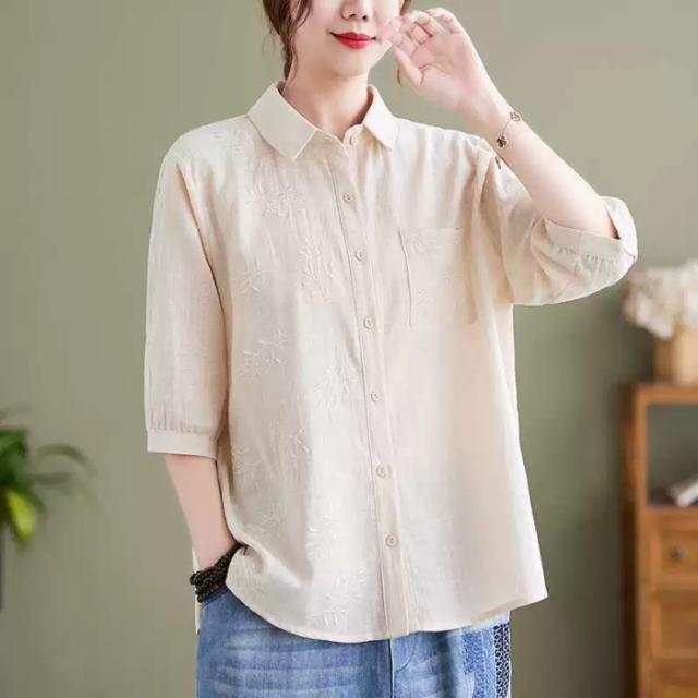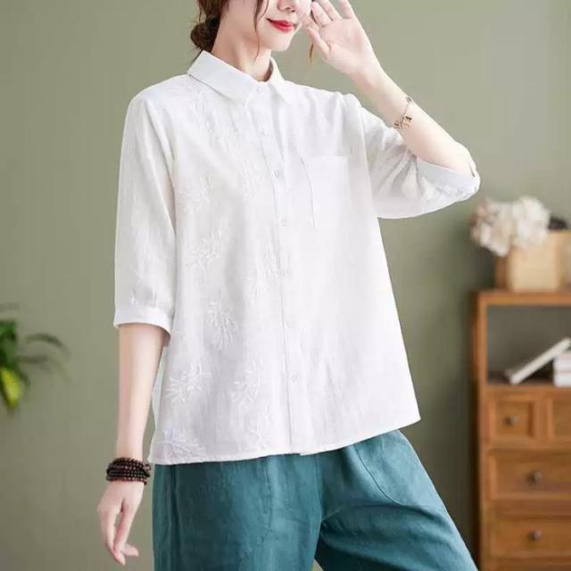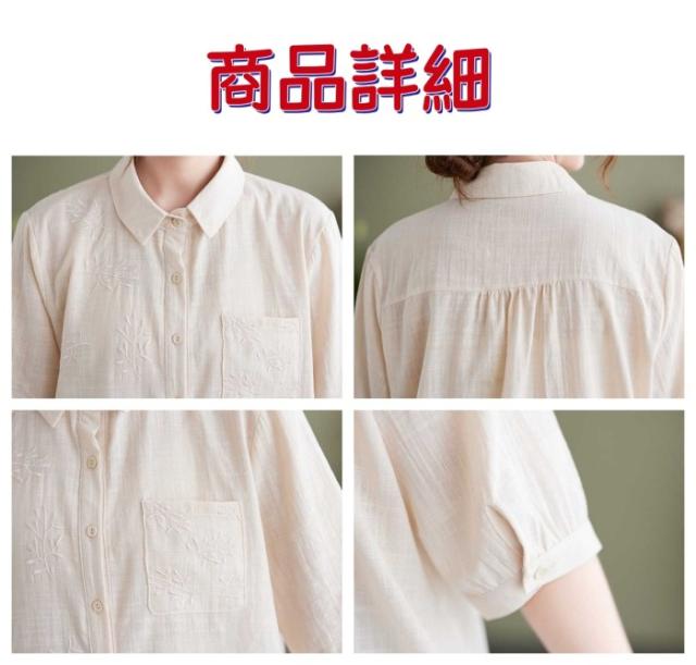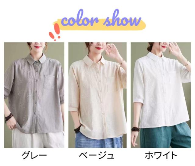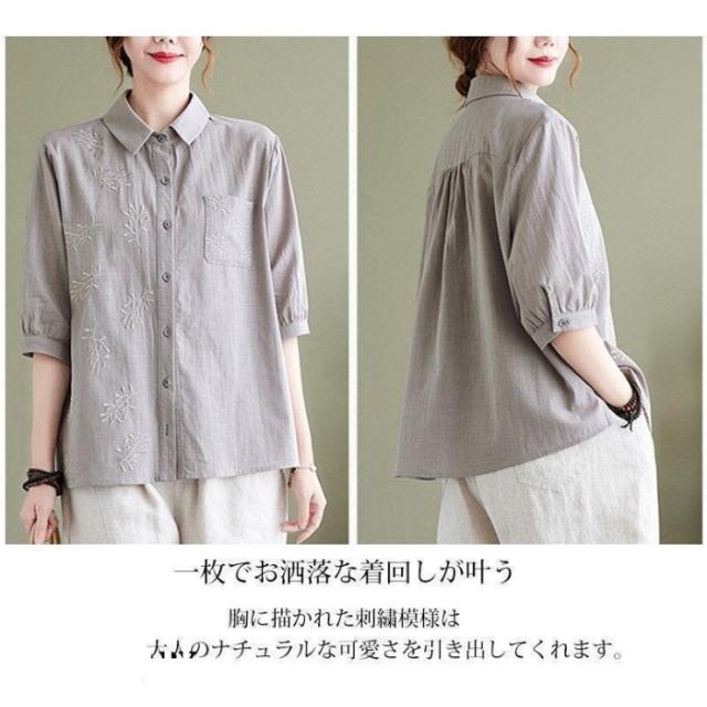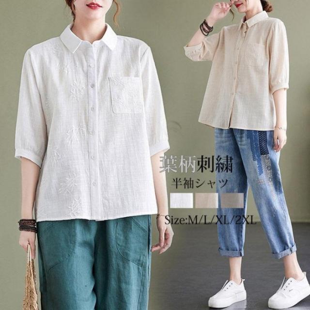 シャツ レディース 半袖 森ガール トップス ブラウス 襟付き 綿麻 刺繍 おしゃれ 白シャツ 夏 秋 新作