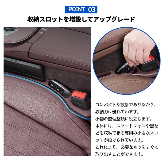 【収納機能付き】物が隙間から落ちるのを防ぐだけでなく、小物用の収納ボックスも取り付けられており、小銭、ペン、カード、鍵、駐車券などの小物をきちんと収納できてシートの空間を有効に利用でき、運転を楽しむことができます。