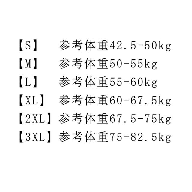 | サイズについての説明 | 【S】参考体重42.5-50kg 【M】参考体重50-55kg 【L】参考体重55-60kg 【XL】参考体重60-67.5kg 【2XL】参考体重67.5-75kg 【3XL】参考体重75-82.5kg |