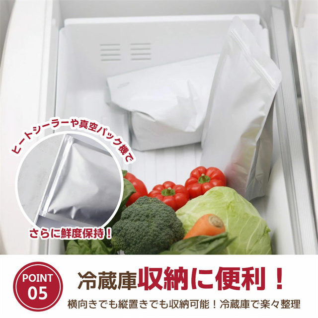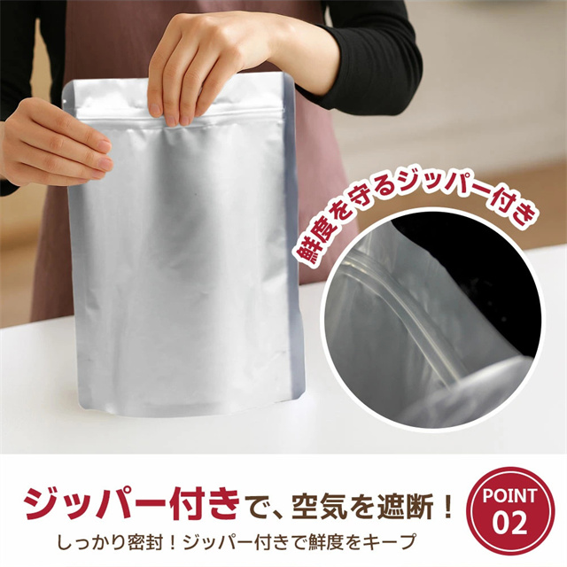 | 特徴 | 【鮮度を守る3層構造】 外層PET・中層アルミ・内層ポリエチレンの3重構造で、光・空気・湿気を徹底ガード。お米や食品を長期間新鮮に保ちます。 【しっかり密封ジッパー付き】 開け閉め簡単なジッパー仕様で、繰り返し使えて経済的。密封力が高く、ニオイ漏れや虫の侵入も防止します。 【便利な自立型デザイン】 袋がしっかり自立するので、詰め替えや収納がラクラク。冷蔵庫や棚でもスッキリ収まり、省スペースで保管できます。 【選べる4サイズ展開】 10kg、5kg、3kg、1kg用の4サイズをご用意。用途に合わせて使い分けでき、小分け保存にも便利です。 【食品からペットフードまで対応】 お米はもちろん、コーヒー豆・ナッツ・乾物・スパイス・ペットフードなど多用途に活躍。鮮度保持で毎日の暮らしを快適に。 |