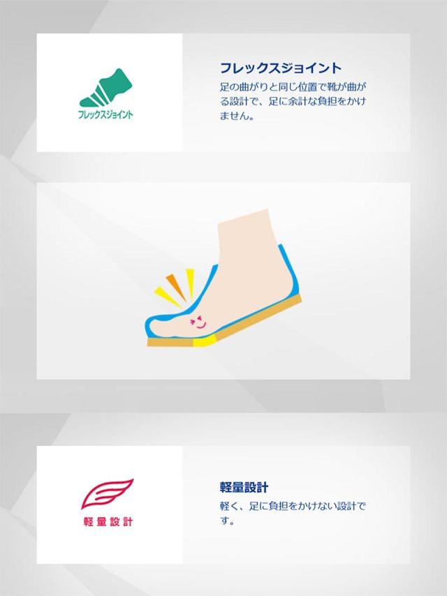 足の曲がりと同じ位置で靴が曲がる設計で、足に余計な負担をかけません。