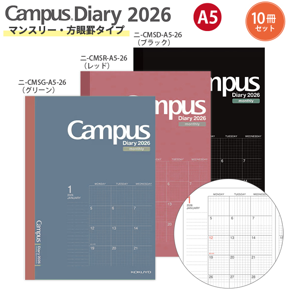 【送料無料 10冊セット】コクヨ キャンパスダイアリー 2026 マンスリー 方眼罫タイプ A5 グリーン ニ-CMSG-A5-26 / レッド ニ-CMSR-A5-26 / ブラック ニ-CMSD-A5-26 見開き両面1カ月 2025年12月〜2027年1月 月曜始まりブロック式 月曜始まり campus diary 2026