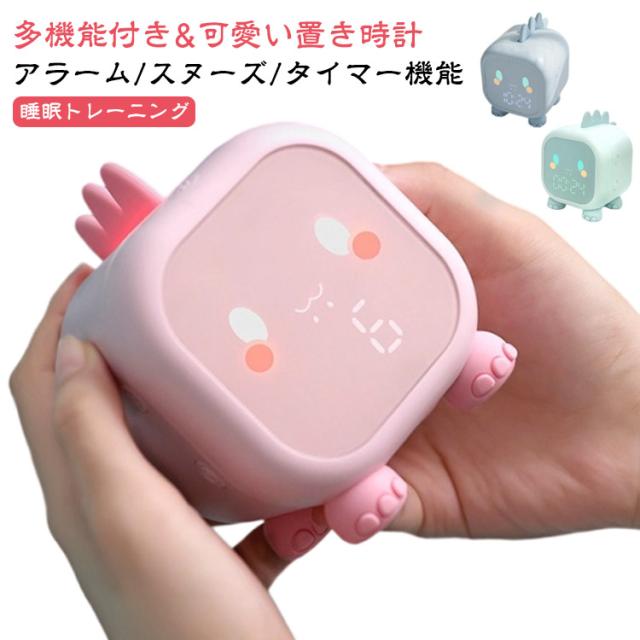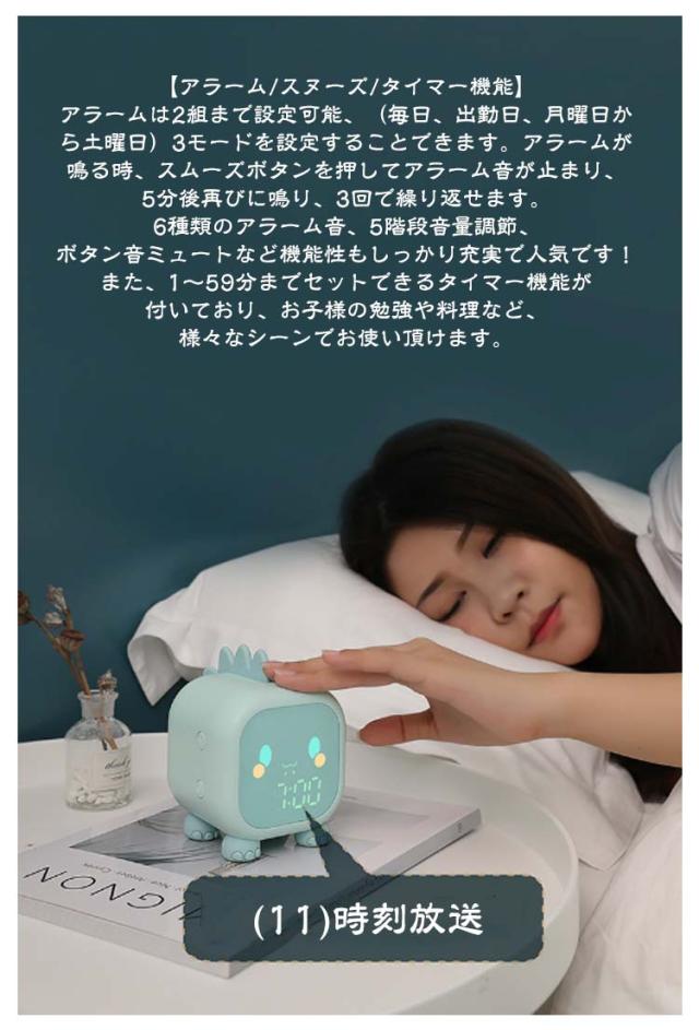| 多機能付き、可愛い恐竜型の置き時計。 【多機能付き&可愛い置き時計】この目覚まし時計は可愛い恐竜のデザインで、滑り止めなシリコン素材で作りられた足が4つ付いてあり、家族や友人へのプレゼントに最適です。(1)12/24時間制 (2)日付 (3)温度表示 (4)デュアルアラーム設定 (5)スヌーズ機能 (6)睡眠トレーニング設定 (7)LEDナイトライト (8)カウントダウン (9)5音量調整 (10)6曲アラーム音選択可能 (11)時刻放送 (12)平日&休日アラーム設定可能 (13)音声感知など、必要なすべての機能を搭載しております。 【睡眠トレーニング】睡眠トレーニング:睡眠トレーニングモードは、主に子供の時間感覚を養い、良い習慣を形成するために使用されます。睡眠トレーニングライトは45分後に自動にオフします。スリープトレーニングライトは6:00-17:59に暗い色から明るい色に変わり、18:00-05:59に明るい色から暗い色に変わります。お子様に幼い頃からよい睡眠習慣を身につけましょう。 【アラーム/スヌーズ/タイマー機能】アラームは2組まで設定可能、(毎日、出勤日、月曜日から土曜日)3モードを設定することできます。アラームが鳴る時、スムーズボタンを押してアラーム音が止まり、5分後再びに鳴り、3回で繰り返せます。6種類のアラーム音、5階段音量調節、ボタン音ミュートなど機能性もしっかり充実で人気です!また、1?59分までセットできるタイマー機能が付いており、お子様の勉強や料理など、様々なシーンでお使い頂けます。 【USB充電式&1200mahバッテリー】バッテリー内蔵なので場所問わずお使い頂けます。省エネ設計により最大20日間使用可能でとっても長持ち(人によって使用習慣が異なるため、10?15日ごとに充電することをおすすめします)。使う場所を選ばない、満電後どこにでも置けます。充電残量が少なくなるとアイコンでお知らせ。不意にバッテリーが無くなってしまう心配もございません。 | |