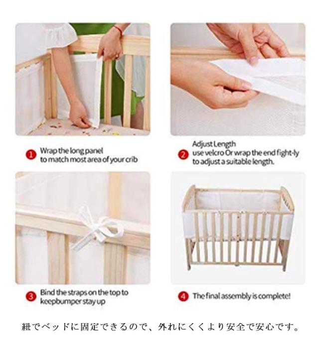 | 通気性抜群なメッシュ素材のベビーベッドガード。 通気性の良いメッシュを使用するので、ベビーベッドの中の空気を循環させて悪い空気がこもりません。 マジックテープで長さ調節ができるから、様々なベッドの形に対応しています。 紐でベッドに固定できるので、外れにくくより安全で安心です。 洗濯機で水洗いできるからお手入れ楽々。 ベッドの柵に頭や手足をぶつけないように保護できる。 柵の隙間を埋めて、手足を挟まないようにできる。 エアコンの風が直接当たらないように防ぐことができる。 上の子やペットのイタズラから守ることができる。 | |