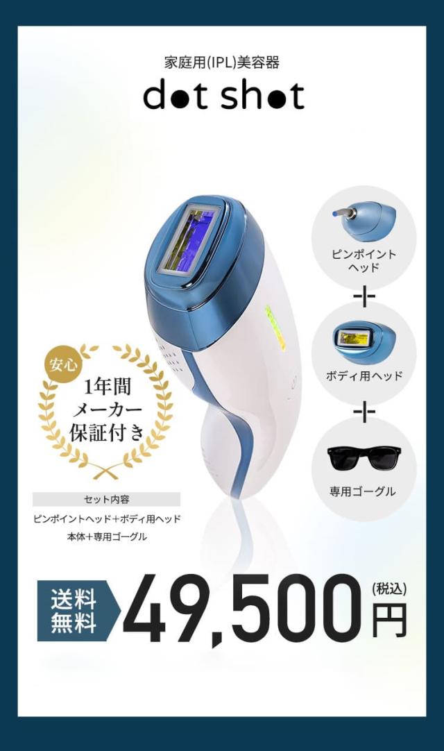 本体/ピンポイントカートリッジ/ボディー&フェイスカートリッジ/照射ノズル/専用ゴーグル/ACアダプター/取扱説明書/ドットジェル(専用ジェル)/ドットクリア(試供品)