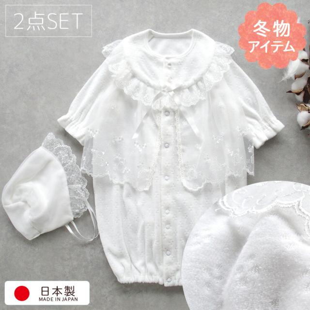 日本製【冬物 ベロア素材 お宮参り】新生児 セレモニードレス 冬 お帽子付き2点セット 男の子 女の子 ふんわりベロア素材 ベビードレス 退院 ツーウェイオール 長袖 白 赤ちゃん 初参り 初宮参り 防寒