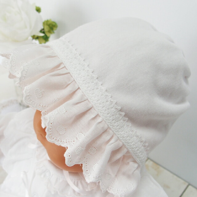 お帽子の素材は、ベビードレスと同じものです。