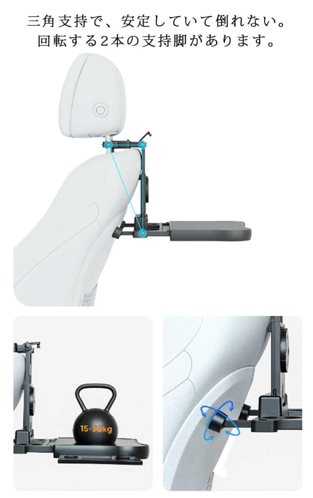 | 後部座席用の超便利な多機能車載テーブル。 ドリンクホルダー・食事トレイ・スマホホルダーが1つになった多機能デザイン◎ パソコン操作や簡単な食事など、ちょっとしたスペースがほしい時に便利です。 スマホホルダーは360度回転可能。縦置きでも横置きでも楽しめます。渋滞でも、車で退屈せずに快適に楽しめます。 三角支持で、安定していて倒れない。 回転する2本の支持脚があります。 使わない時は折り畳めるので場所を取らず便利ですね♪ | |
