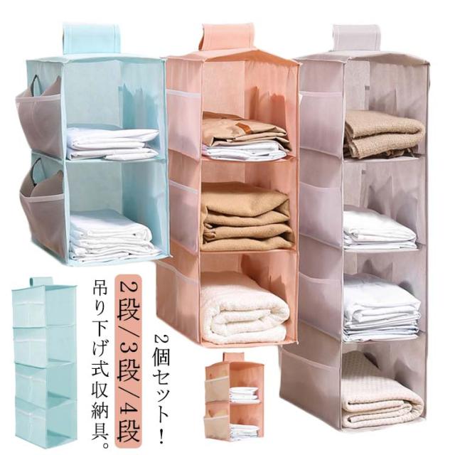 2個セット 吊り下げ収納 クローゼット 衣類収納 折りたたみ 下着 小物 タオル 吊り下げ式 収納 ラック 2段 3段 4段 ランドリー ポケット付き 吊下 コンパクト 薄型 サイドポケット 洗える ハンカチ 帽子 ランドセル入れ おもちゃ 洗面所 脱衣所 送料無料