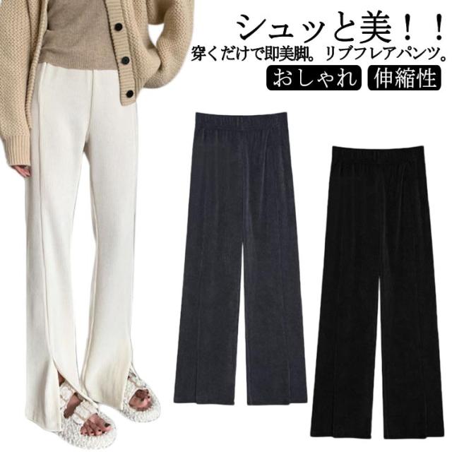 リブパンツ フレアパンツ リブフレアパンツ レディース ロング パンツ ボトムス リブレギンス フレアレギンス ストレッチ スリット ウエストゴム リブ 美脚 細見え 脚長 無地 低身長 高身長 おしゃれ きれいめ 着やせ 韓国ファッション カジュアル