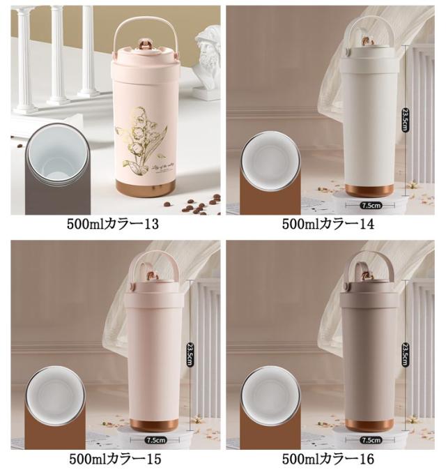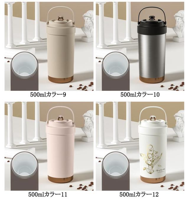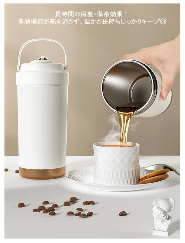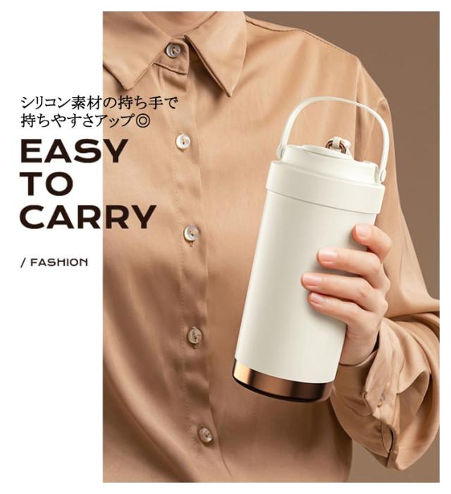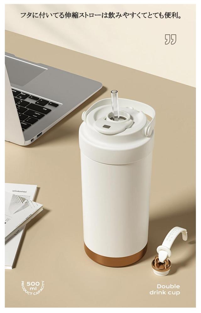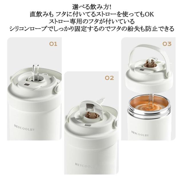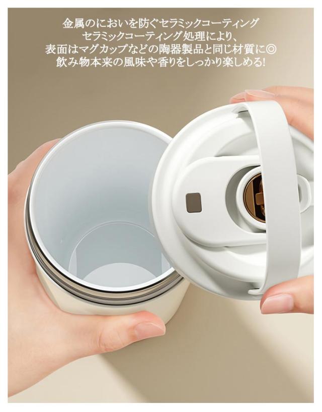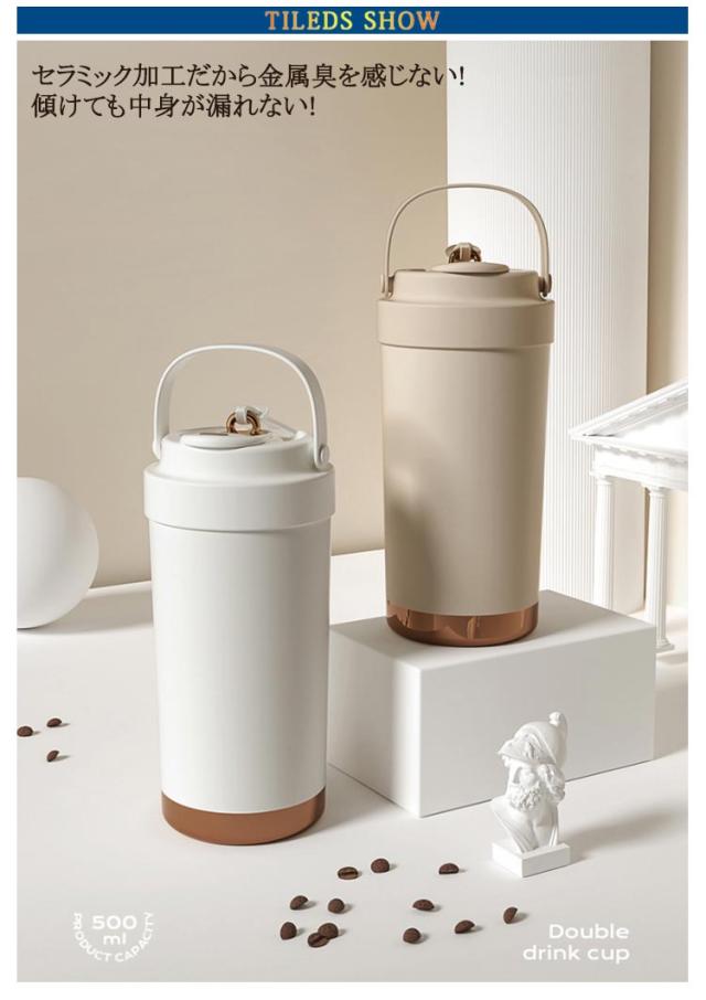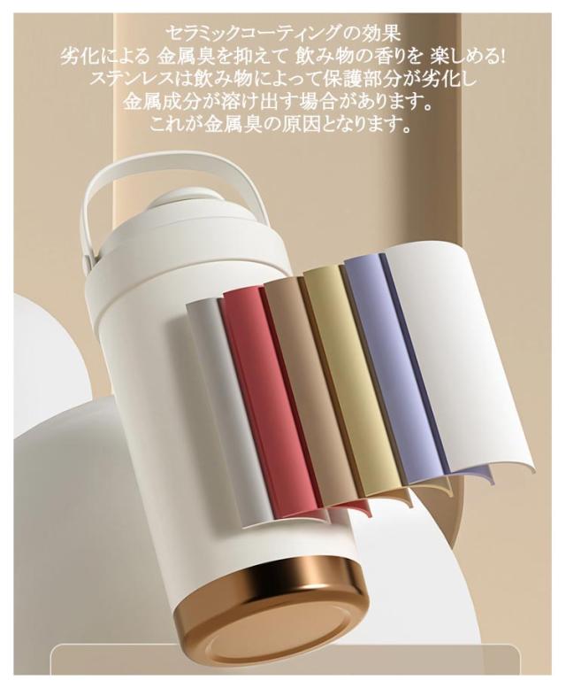 | 500ml/750ml 3way!セラミックの力で飲み物を美味しさが際立つ セラミック加工だから 金属臭を 感じない! 傾けても中身が 漏れない! シリコン素材の持ち手で持ちやすさアップ◎ セラミックコーティングの効果 劣化による 金属臭を抑えて 飲み物の香りを 楽しめる! ステンレスは飲み物によって保護部分が 劣化し金属成分が溶け出す場合があります。 これが金属臭の原因となります。 金属のにおいを防ぐセラミックコーティング セラミックコーティング処理により、表面はマグカップなどの陶器製品と同じ材質に◎ 飲み物本来の風味や香りをしっかり楽しめる! 長時間の保温・保冷効果! 多層構造が熱を逃さず、温かさ長持ちしっかりキープ◎ 選べる飲み方! 直飲みも フタに付いてるストローを使ってもOK ストロー専用のフタが付いている シリコンロープでしっかり固定するのでフタの紛失も防止できる 密封設計でしっかり漏れを防止 中身の液体漏れを気にせず安心して持ち運べます。 手のひらから伝わる 上品な質感 摩擦に強いラッカー仕上げで、 肌ざわりもなめらかで心地よい。 フタに付いてる伸縮ストローは飲みやすくてとても便利 | |