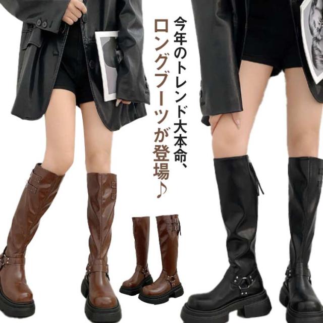 ジョッキーブーツ ニーハイブーツ ロングブーツ レディース 膝丈 レディース 厚底ロングブーツ 厚底 ロング丈 太ヒール 秋冬 ブーツ 靴 美脚 ファスナー付き シンプル おしゃれ カジュアル 韓国 大人 ブラウン ブラック