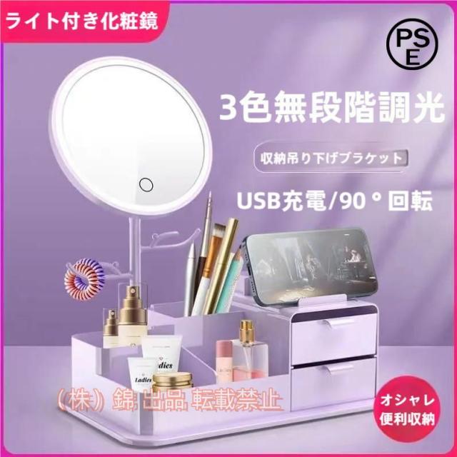化粧品収納ボックス 鏡付き LED ライトミラー メイクボックス 卓上鏡台 ミニドレッサー 引き出し 株式会社錦 化粧鏡付き 無段階調光 USB充電 角度調整可能
