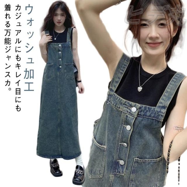 ヴィンテージ ジャンスカ ポケット付き ロング レトロ デニムサロペットスカート ジャンパースカート ウォッシュ加工 デニム サロペット ワンピース きれいめ デニム スカート 春夏秋冬 オーバーオール オールインワン レディース 大人 カジュアル デニムワンピース