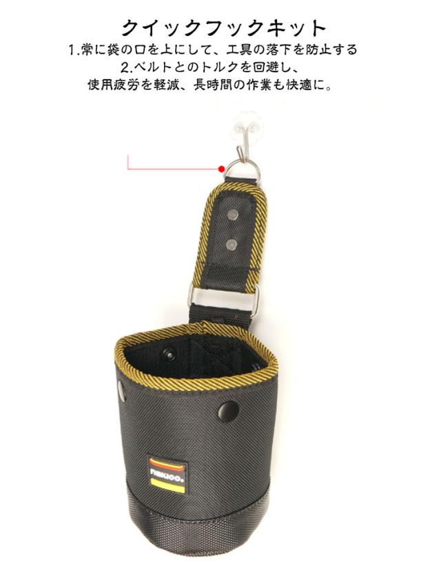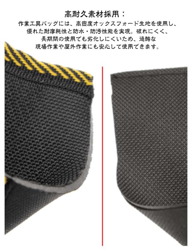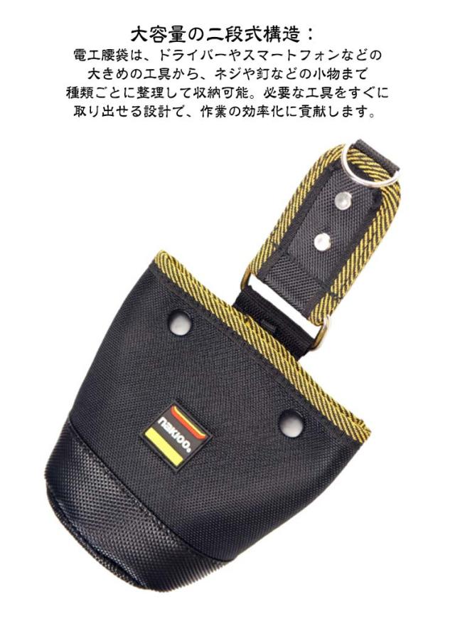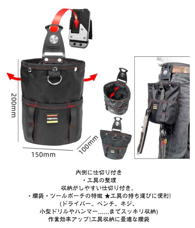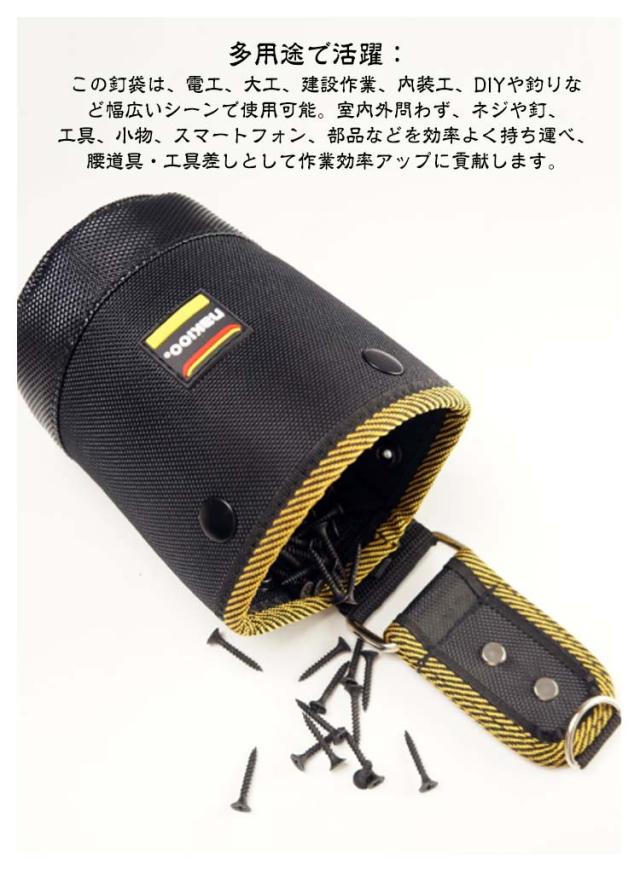 | 小物収納 高密度オックスフォード生地 ウエストポーチ ●バネ式開閉デザイン:袋口はラッチを軽く引くだけで簡単に開閉可能。工具や部品を素早く出し入れでき、作業時間を短縮し、緊急時の対応もスムーズ。大工腰袋として作業効率を大幅にアップします。 ●大容量の二段式構造:電工腰袋は、ドライバーやスマートフォンなどの大きめの工具から、ネジや釘などの小物まで種類ごとに整理して収納可能。必要な工具をすぐに取り出せる設計で、作業の効率化に貢献します。 ●高耐久素材採用:作業工具バッグには、高密度オックスフォード生地を使用し、優れた耐摩耗性と防水・防汚性能を実現。破れにくく、長期間の使用でも劣化しにくいため、過酷な現場作業や屋外作業にも安心して使用できます。 ●簡単着脱設計:工具入れポーチは、着脱式工具ホルダー付きで、ベルトへの取り付け・取り外しが簡単に可能。工具不要で素早く着脱でき、腰への負担を軽減し、長時間作業の快適性を高めます。 ●多用途で活躍:この釘袋は、電工、大工、建設作業、内装工、DIYや釣りなど幅広いシーンで使用可能。室内外問わず、ネジや釘、工具、小物、スマートフォン、部品などを効率よく持ち運べ、腰道具・工具差しとして作業効率アップに貢献します。 バネ式クイッククリップポケットロ ・ポケットロはバネ式クイッククリップ設計で、 操作が簡単かつ柔軟 ・リングを内側に押せばポケット口が閉じる 内側に仕切り付き ・工具の整理 収納がしやすい仕切り付き。 ・腰袋・ツールポーチの特徴 ★工具の持ち運びに便利! (ドライバー、ペンチ、ネジ、 小型ドリルやハンマー......までスッキリ収納) 作業効率アップ!工具収納に最適な腰袋 ステンレス製スイベルフック 丈夫で耐久性に優れ、スイベル設計により常に袋の口が上を向くため、 狭い作業スペースでも使いやすく、内部の物が不意に落ちるのを防ぎます。 ★このバッグはベルトに装着して使用します。 両手が自由に使えて便利! クイックフックキット 1.常に袋の口を上にして、工具の落下を防止する 2.ベルトとのトルクを回避し、使用疲労を軽減、長時間の作業も快適に。 ベルト不要クイッククリップ設計 ・ステンレス製スイベルフック ・汎用ベルト用クイッククリップメス側に滑り止めバネ内蔵 ・バネ式開閉リングポケットロ ・外付け収納ポケット ・内蔵の収 | |