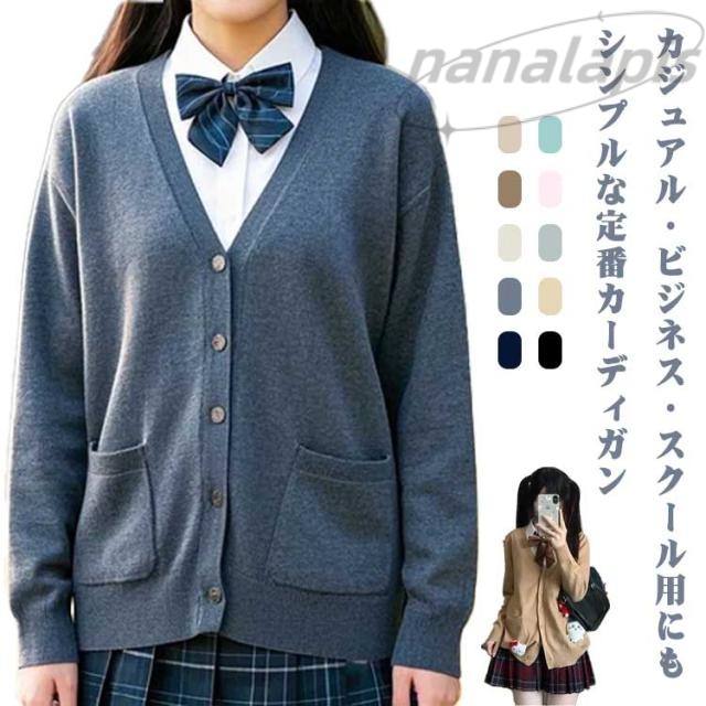 | カジュアル・ビジネス・スクール用にもシンプルな定番カーディガン 無地ニットなので、普段はもちろん色々なシーンで着用できるカーディガンです。 首元を綺麗に見せるVゾーンと、程よくゆとりを持たせたシルエットが清楚さを演出 シンプルなデザインのVネックカーディガン ポリエステル素材だから毛玉が出来にくく洗濯機で丸洗いOK | |