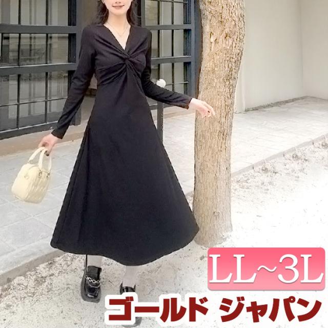 春新作 大きいサイズ レディース ワンピース カシュクール風ツイストワンピース ワンピ Vネック 長袖 膝丈 ツイスト ねじり 切替え フレア 無地 ストレッチ フィット タイト オケージョン パーティー 通勤 上品 ゆったり 冬服 春服 LL 2L 3L ブラック 黒 ゴールドジャパン