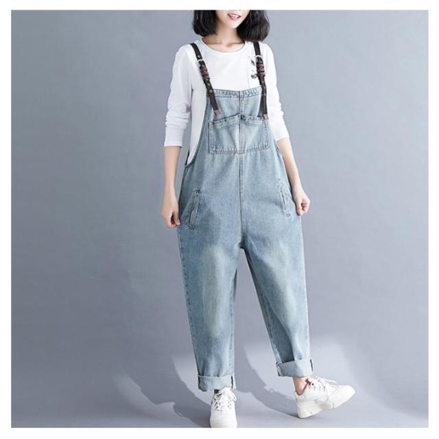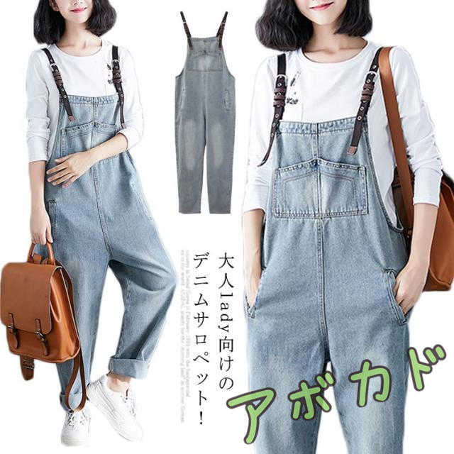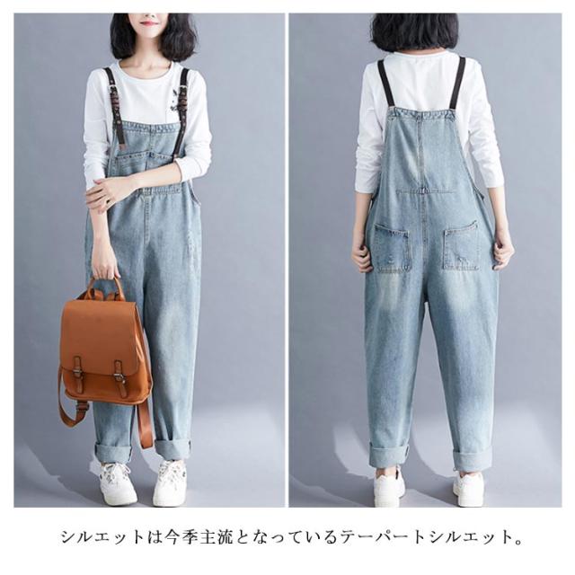 デニムサロペット オーバーオール レディース オールインワン サロペット ロールアップ ロング丈 デニムパンツ デニム ボトムス サロペットパンツ サルエル ゆったり カジュアル