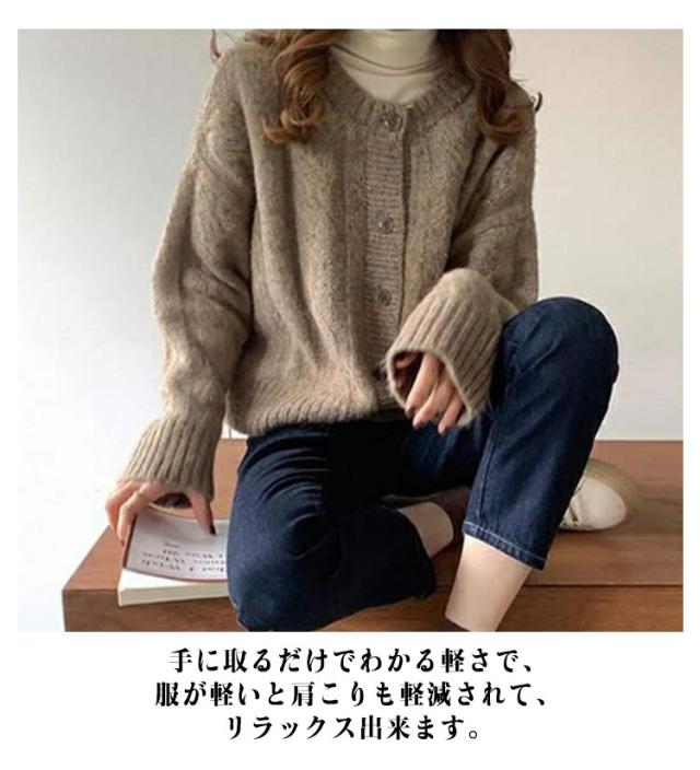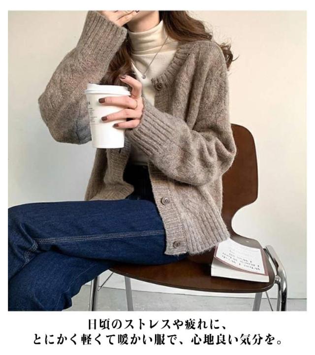 | デイリー使いにオススメのカーディガン。 日頃のストレスや疲れに、とにかく軽くて暖かい服で、心地良い気分を。 手に取るだけでわかる軽さで、服が軽いと肩こりも軽減されて、リラックス出来ます。 ふんわりとした肉厚感と暖かみのあるニット素材を使用しており、暖かく着て頂けます。 長過ぎない丈感で、ボトムも迷わず合わせやすいのも◎ | |
