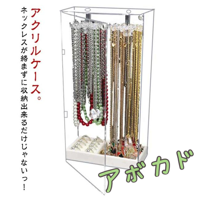| アクリルケース。ネックレスが絡まずに収納出来るだけじゃないっ!お気に入りのジュエリーを、飾って、見せて、便利に収納! 扉式なのでネックレスの出し入れも楽々!扉の取っ手を軽く押し上げると扉が開きます。 フックは回転するので、奥に吊るしたものも取り出しやすくなってます! 素材は無色・高透明度のアクリル製なので、アクセサリーを見せながら収納できインテリアとして最適です。 透明度が高く、シンプルなデザインなのでネックレスを入れて飾っておくだけで お部屋のインテリアにも! | |