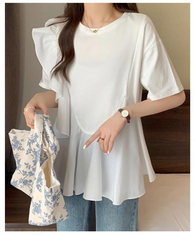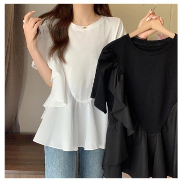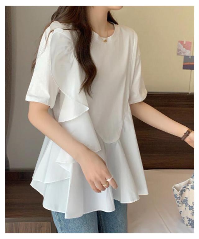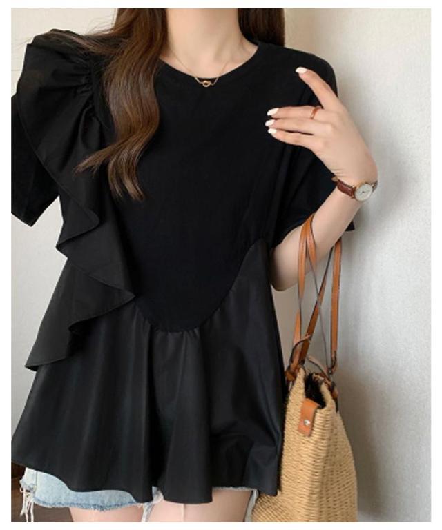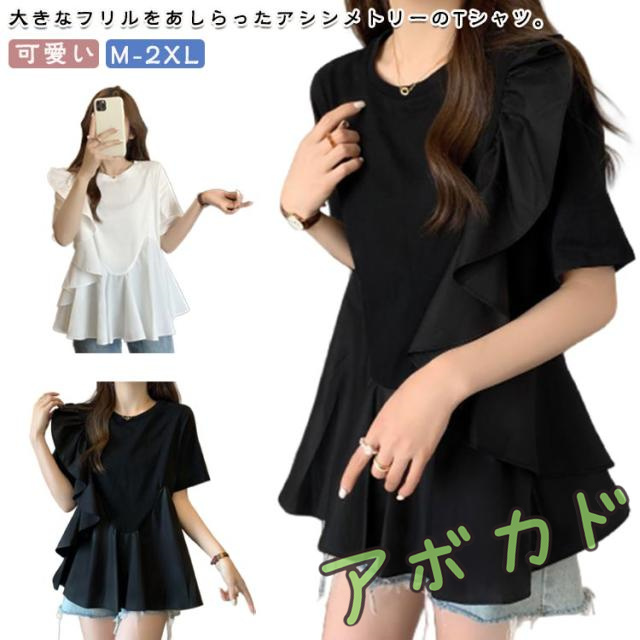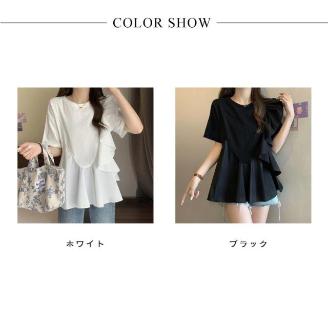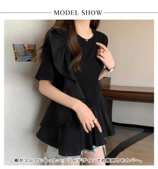 トップス ブラウス シャツ Tシャツ フリル ラッフル プルオーバー ペプラム アシンメトリーデザイン レディース きれいめ カジュアル フェミニン 大人 可愛い 半袖 体型カバー ナチュラル 白 黒 春 秋 夏 20代 30代 40代 50代