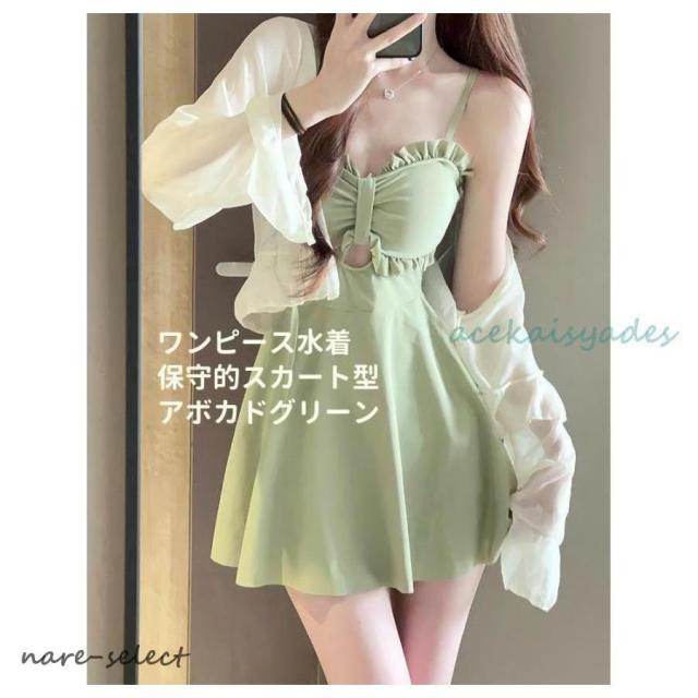 新作 夏 ワンピース水着 女性 保守的なスカート型 アボカドグリーンスリム 温泉用 水着 トレンド 星柄 スポーツスタイル