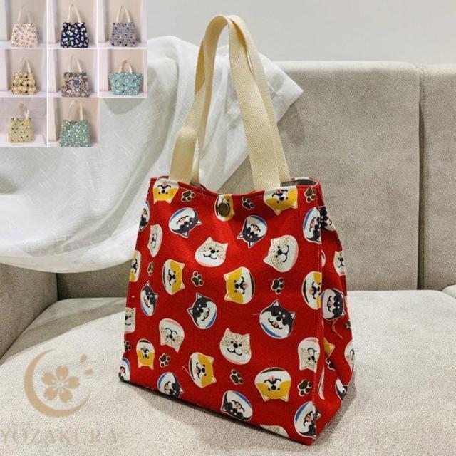 ミニバッグ コットンキャンバス ミニ トートバッグ ねこ 猫 ネコ フラワー 花柄 綿 帆布 小さめ 裏地 シンプル スクエア お買い お出かけ 14柄 カラーッド イ