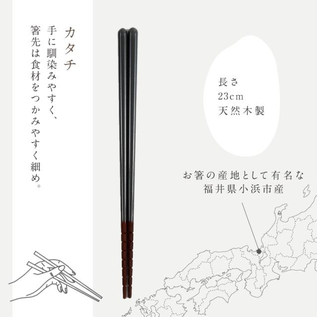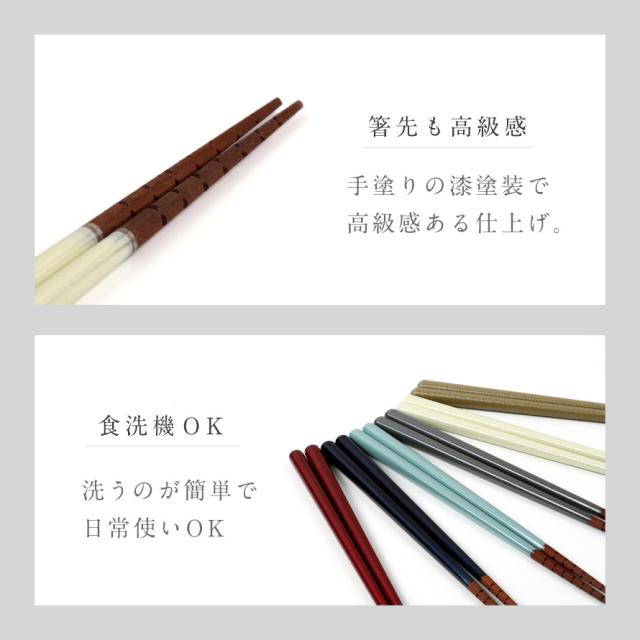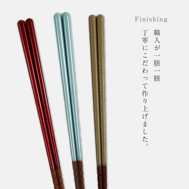 このお箸は、箸の名産地・福井県小浜市で職人が一膳ずつ丁寧に仕上げた日本製。天然木の風合いと、艶やかな塗りにやさしい色合いが、和洋問わず食卓に自然に馴染みます。