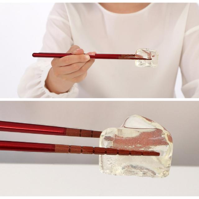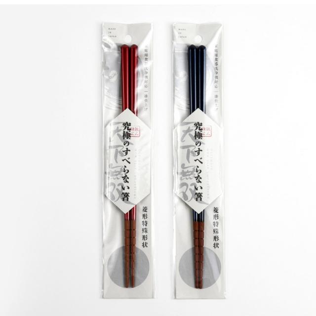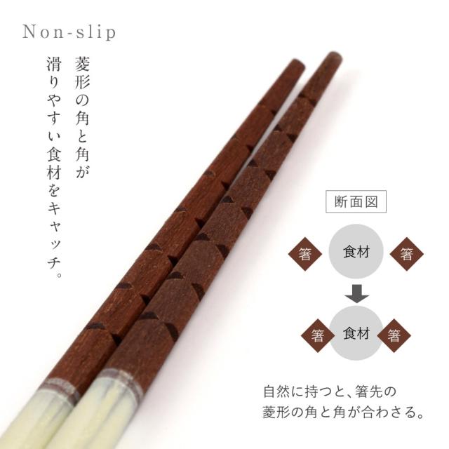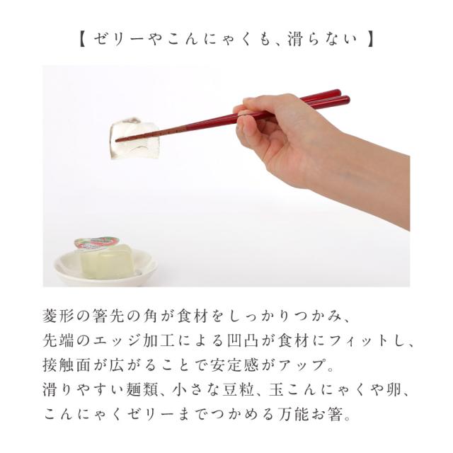 一般的な「すべらない箸」といえば、先がザラザラしているものを思い浮かべる方が多いかもしれません。こちらのお箸は、箸先を菱形にカットし、さらにエッジ加工を施した特別仕様。菱形の角が食材をしっかりキャッチし、細かな凹凸が食材にフィットすることで安定感が増し、麺類や小さな豆、玉こんにゃくやこんにゃくゼリーまで楽につかめます。まさに「究極のすべらない箸」です。