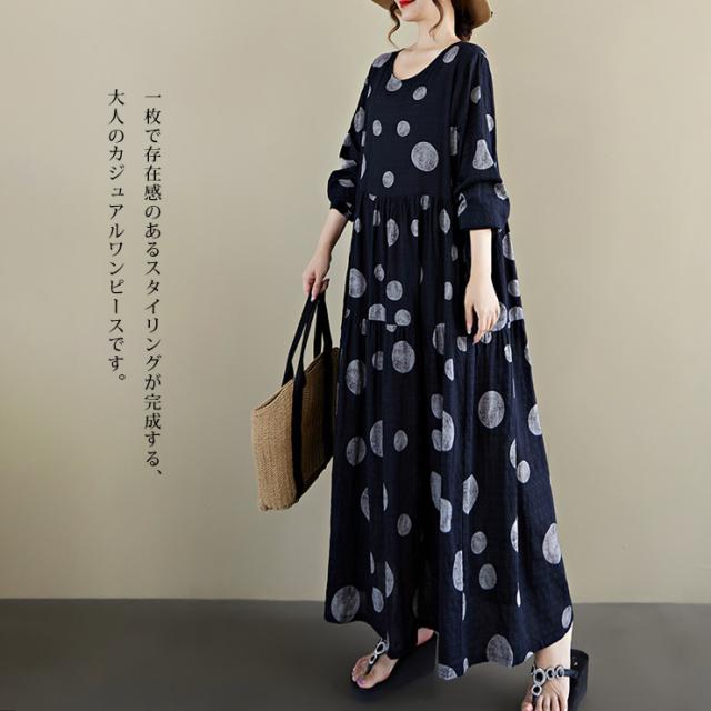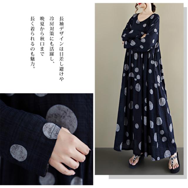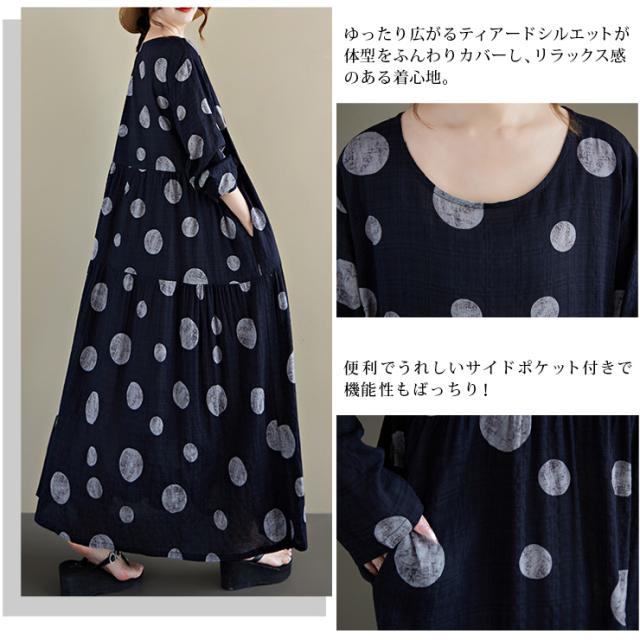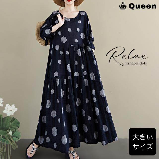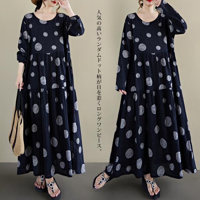 大きいサイズ ワンピース 長袖 レディース マキシワンピース 春 秋 ドット柄 (605007)