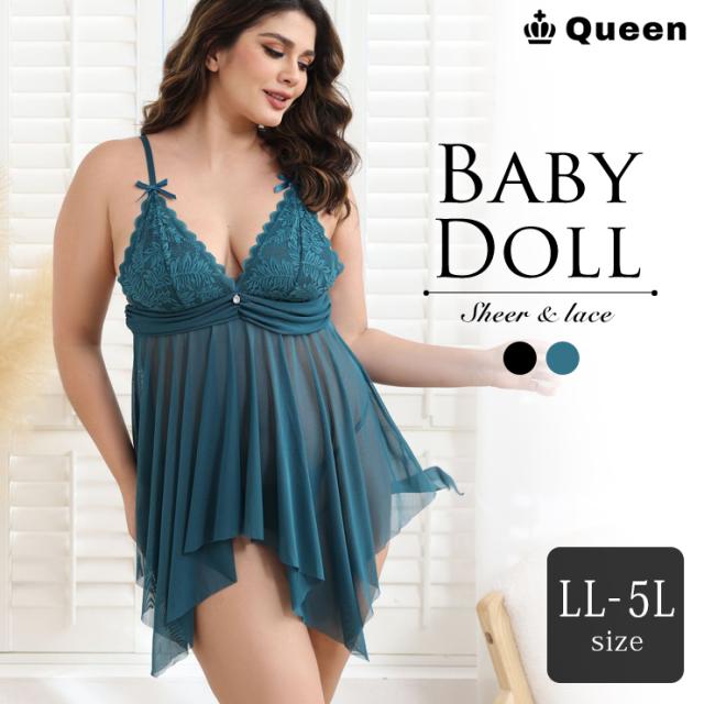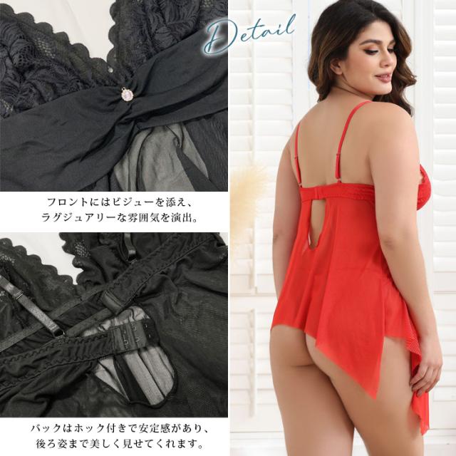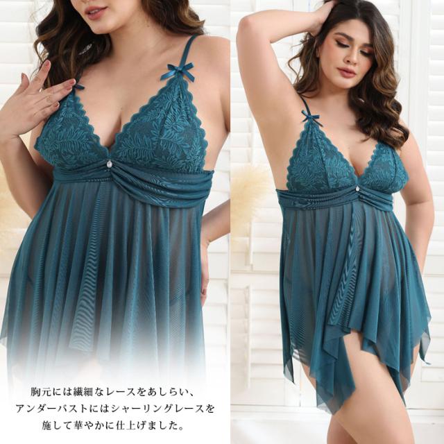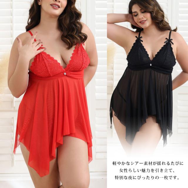 軽やかな透け感とレースの組み合わせで美しく魅せる大きいサイズのベビードールセット。特別な夜にぴったり