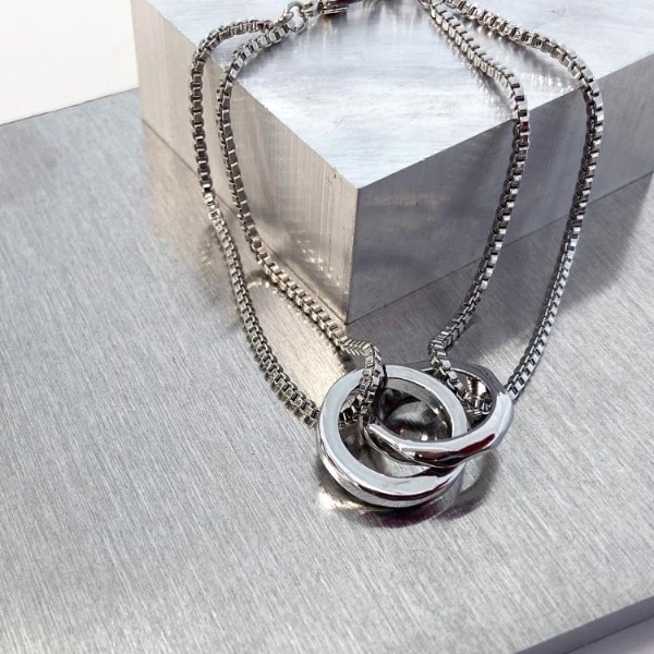 二つのリングを組み合わせた贅沢なデザインで、動くたびに程よく揺れて手首にアクセントを生みます。