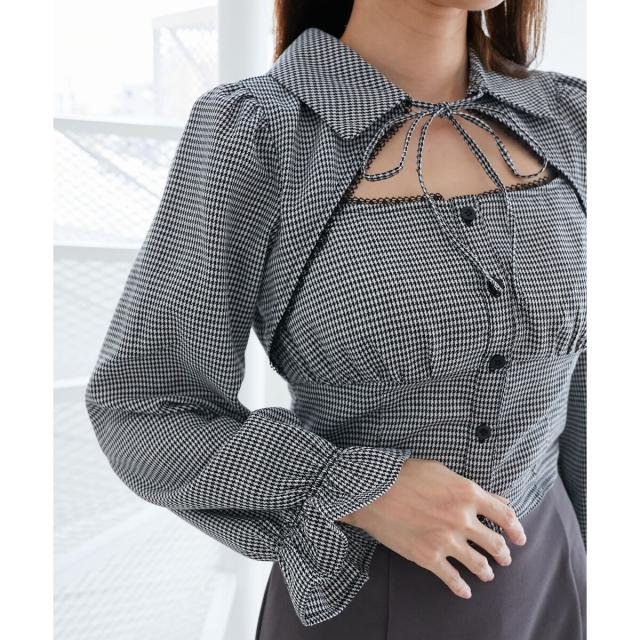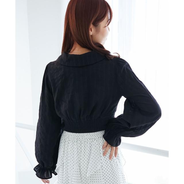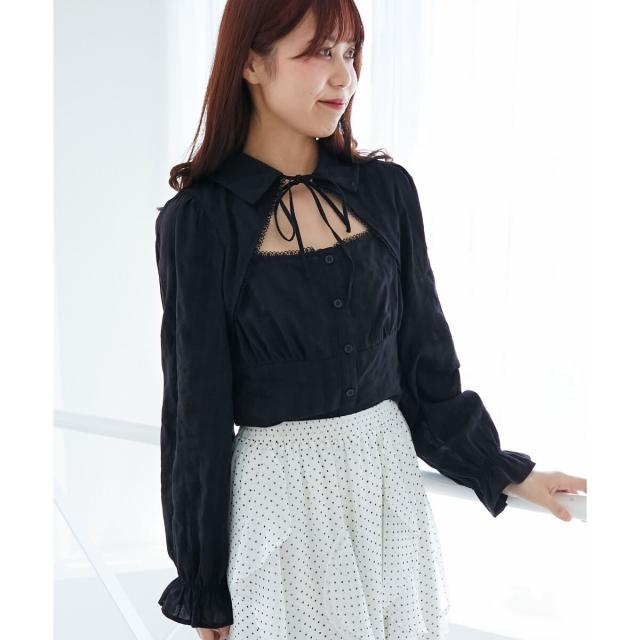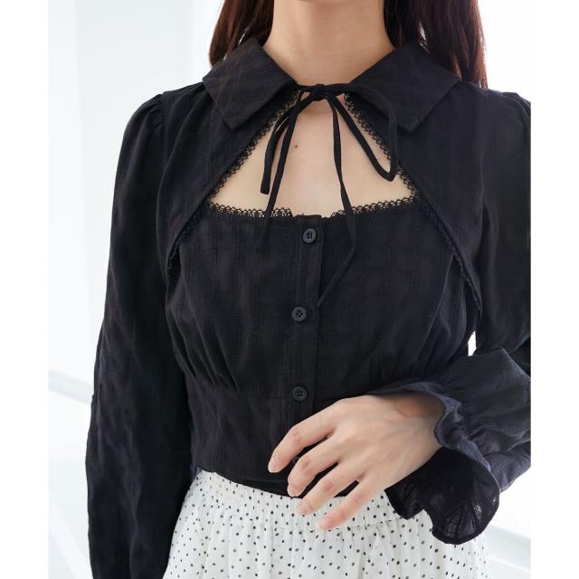襟付きブラウスに肌みせデザインを加えて華やかに仕上げたブラウス。
