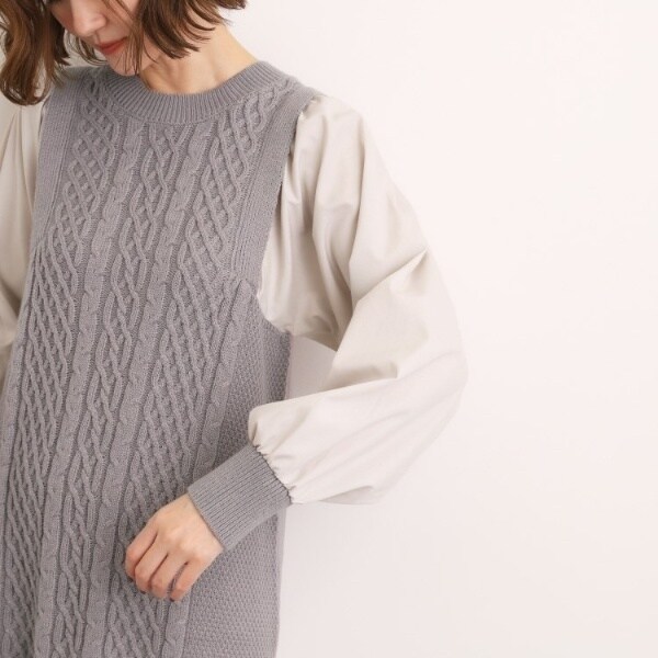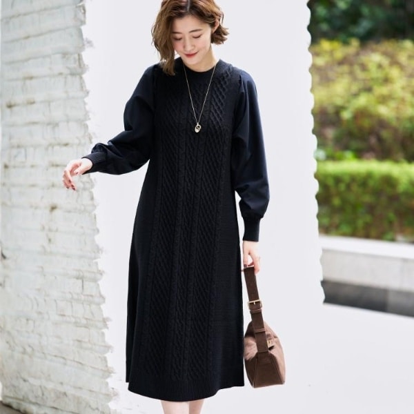 【石川梨華さん着用】一枚で華やぐ、袖布帛ケーブルニットワンピース
