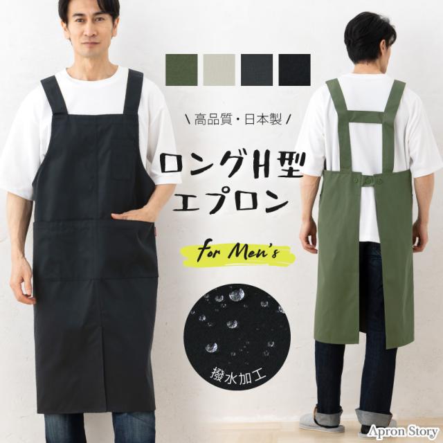 【メール便1枚のみ送料無料】【日本製】スリット入りロングH型メンズエプロン 綿ポリ 男性用 大きいサイズ 着やすい 作業着 H型エプロン 無地 黒 しわになりくい シンプル プレゼント ギフト【N】【M】