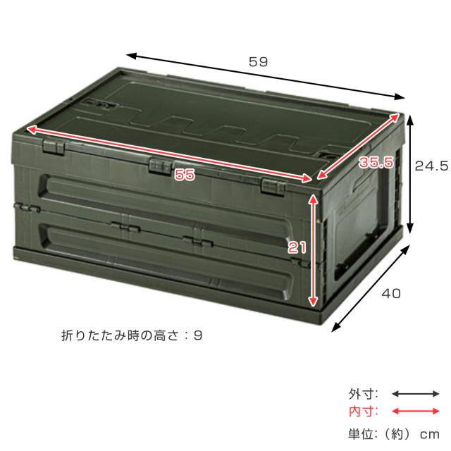 | サイズ | 外寸:約 幅59×奥行40×高さ24.5(cm) 内寸:約 幅55×奥行35.5×高さ21(cm) 折りたたみ時:約 高さ9(cm) |