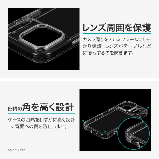 【耐衝撃】 カメラ周りをアルミフレームでしっかり保護/硬いポリカーボネートと柔らかく耐衝撃性に優れたTPUのハイブリッド仕様/柔軟性があり着脱が簡単/角に衝撃を吸収するエアクッションを搭載/ボタンまで保護。
