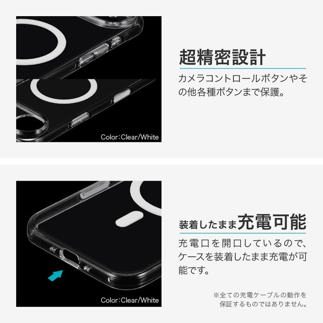 MagSafeアクセサリが使えるマグネットリング搭載/長期間使用しても黄変しない全面ポリカーボネート設計で美しさ長持ち/厚みがあり衝撃を分散するエア構造/カメラレンズ周りを高く設計/カメラコントロールボタンやその他各種ボタンまで保護する超精密設計。