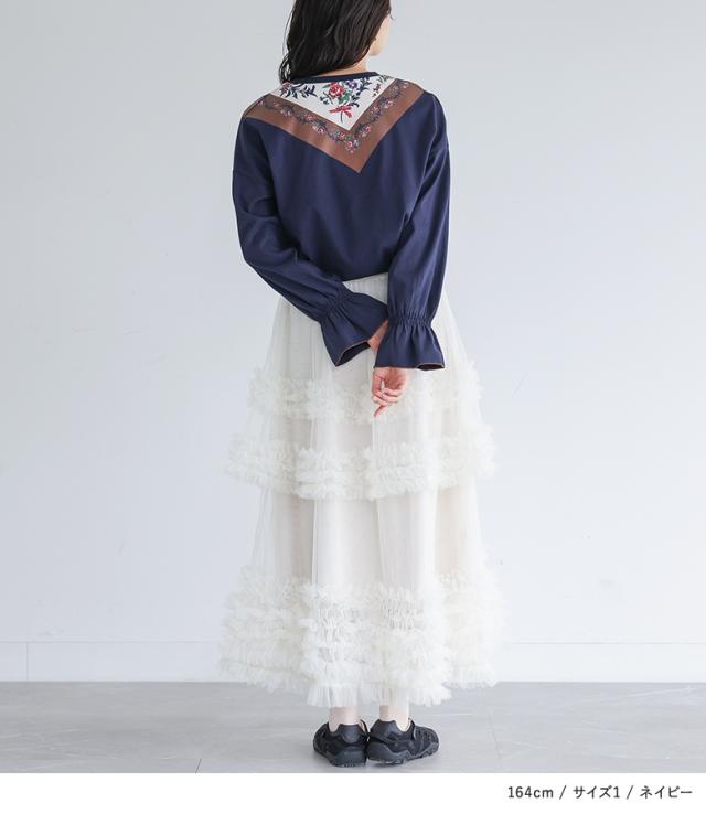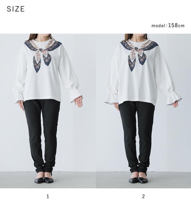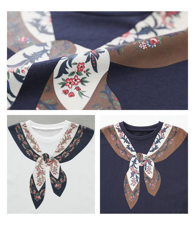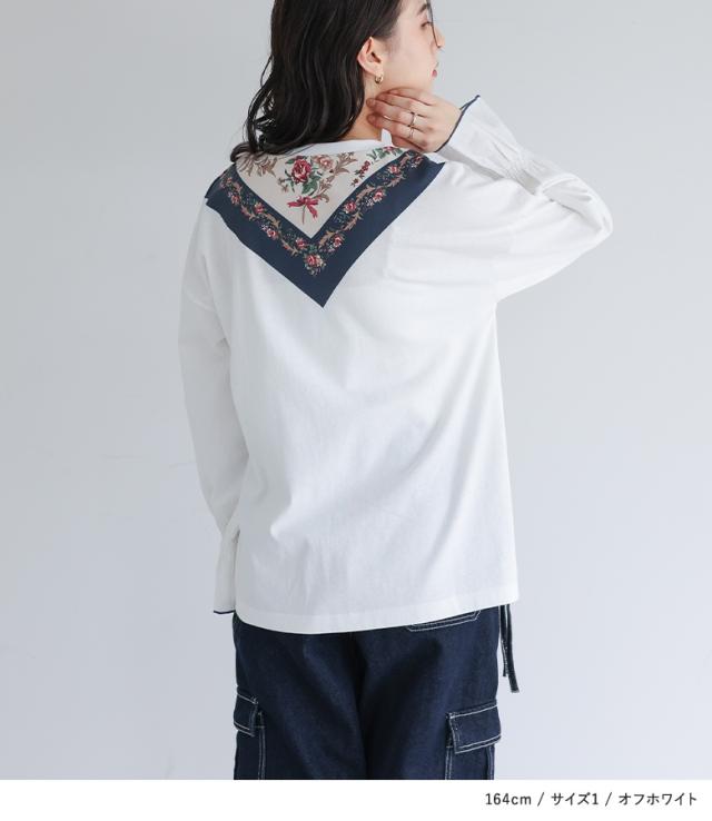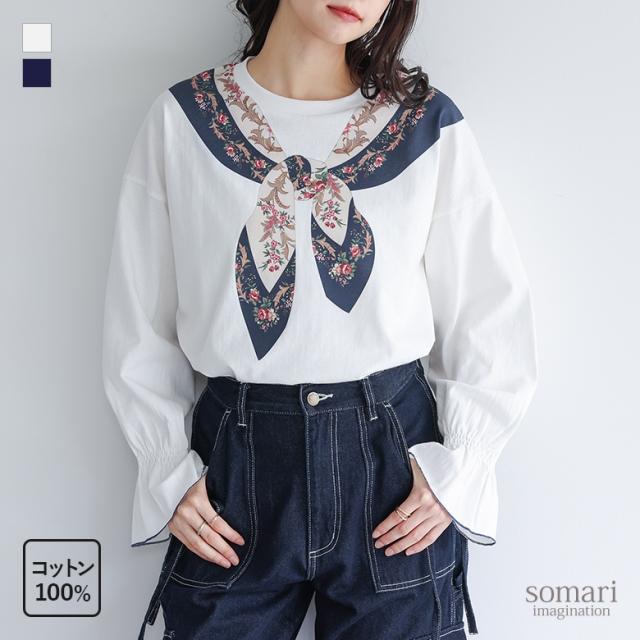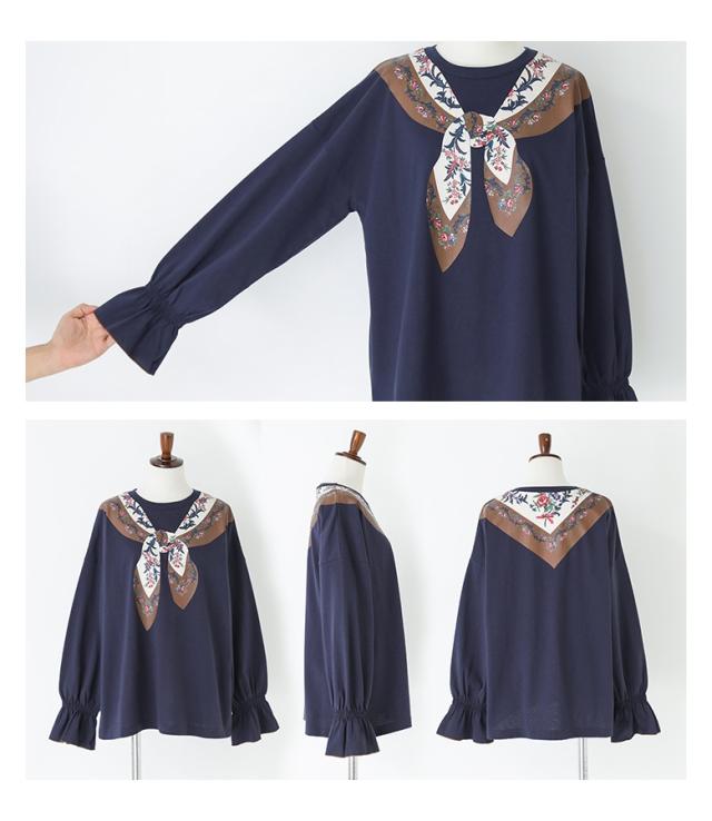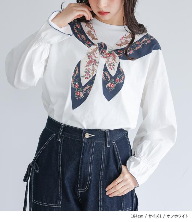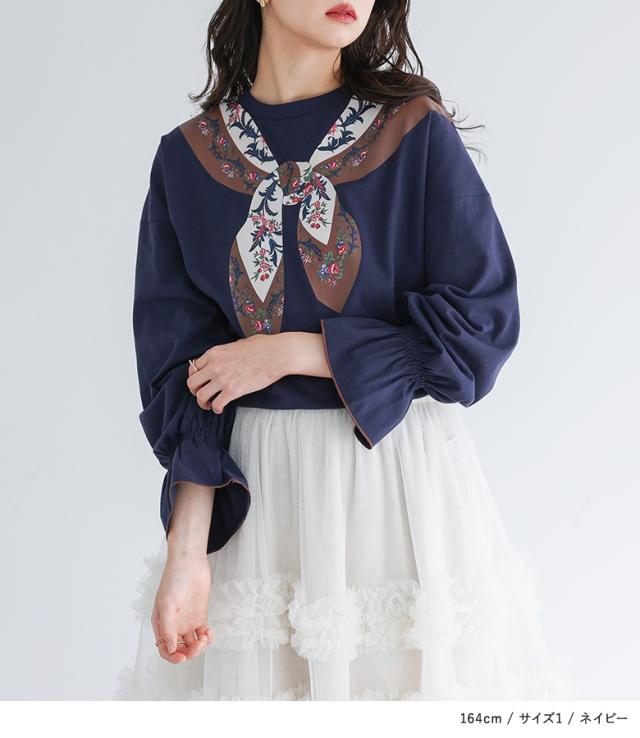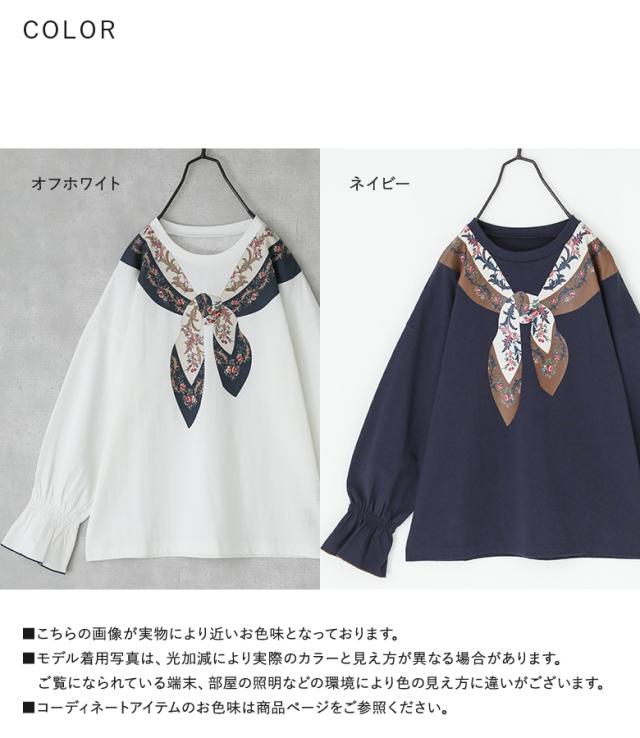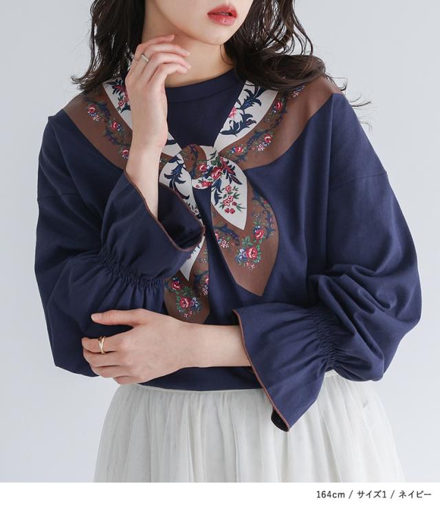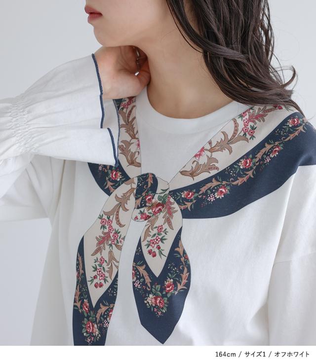 『スカーフプリントカットソー』※メール便可※【10】[カットソー 長袖 レディース トップス ロンT プリントT トロンプルイユプリント 花柄スカーフ 綿100% コットン100% キャンディースリーブ 秋 冬 春]