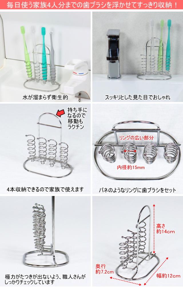 毎日使う家族4人分までの歯ブラシをすっきり収納できます。 浮かせてしまう事ができるので、いつも清潔に保てます。 本体はサビに強い18-8ステンレス製。丈夫で長持ちします。 くるくるとバネのようになったリング部分に歯ブラシを差し込みます。 リングの広い方で内径約15mm。 洗面台を清潔にすっきり収納できて便利です。 土台も極力がたつきが出ないよう、職人さんがしっかりチェックしているので安心です。 ■他にも歯ブラシとチューブやコップも収納できるスタンドもございます↓ 歯ブラシチューブスタンド G-548 歯ブラシチューブ・コップスタンド G-549 |
