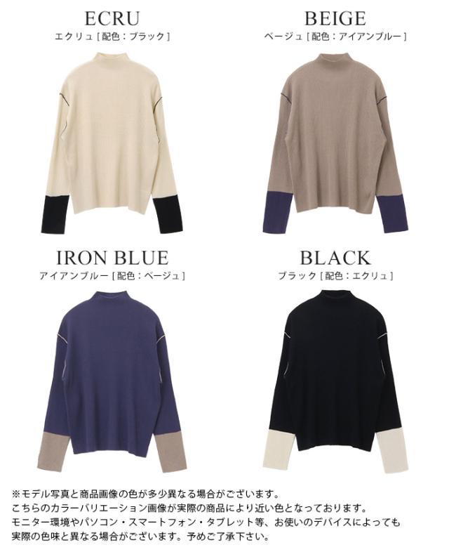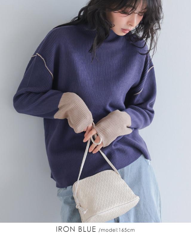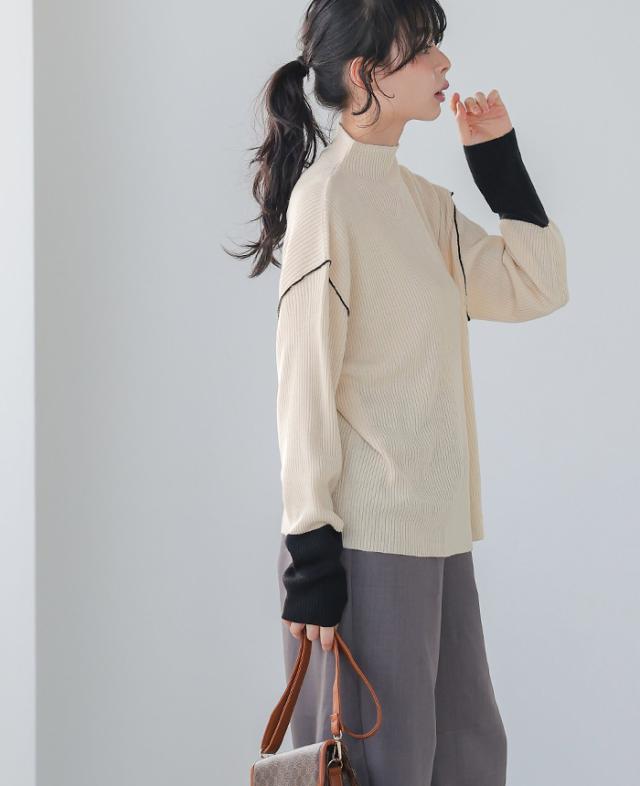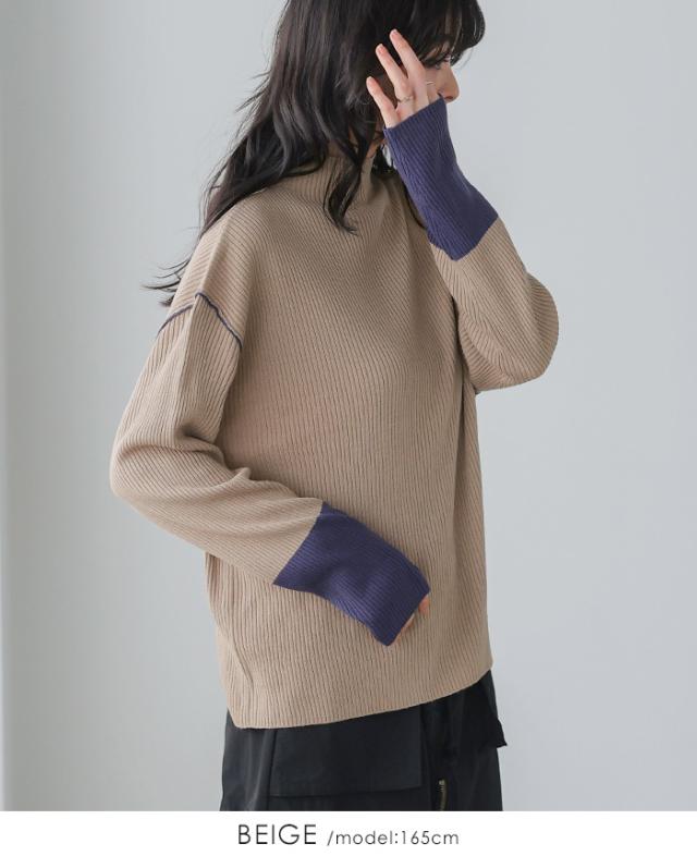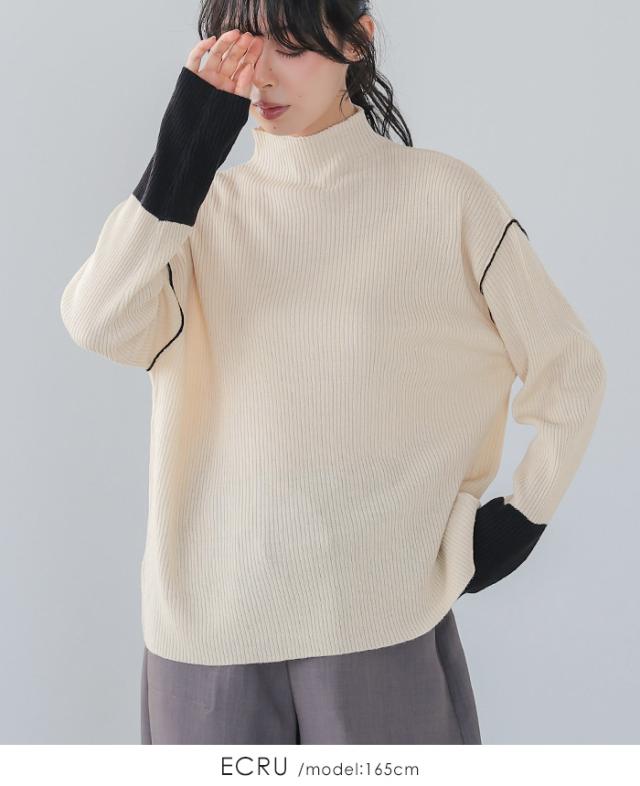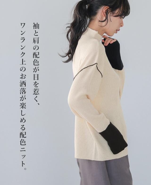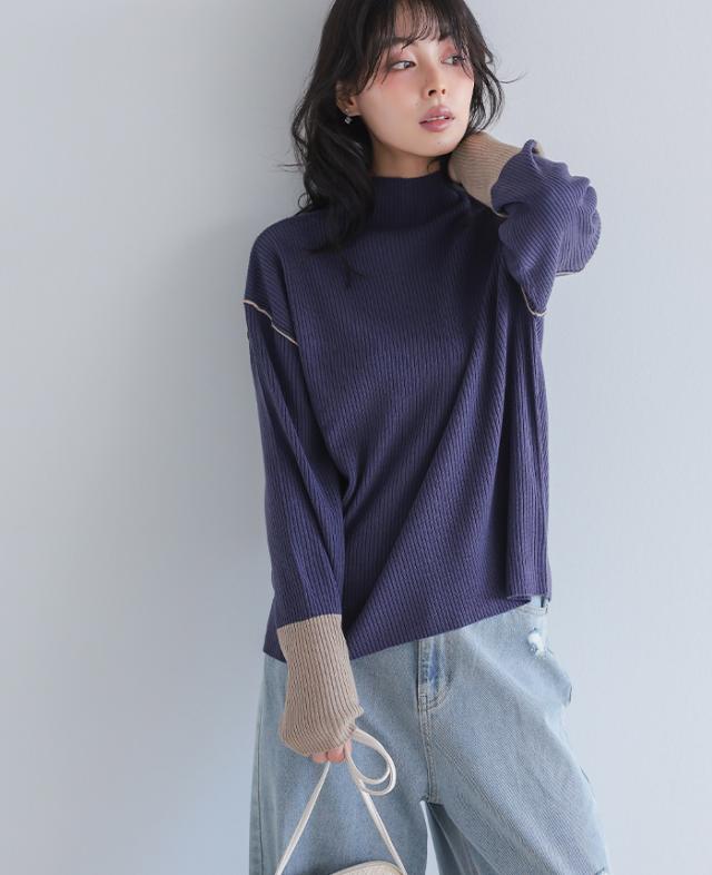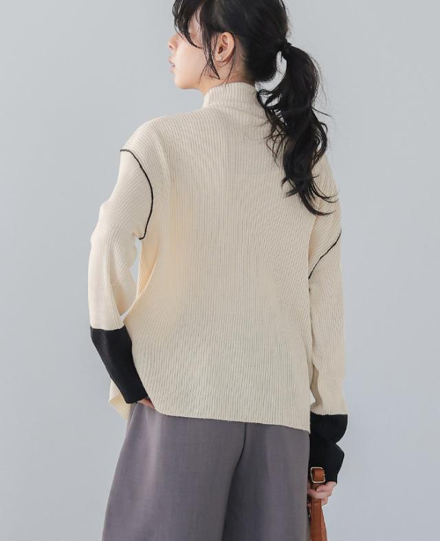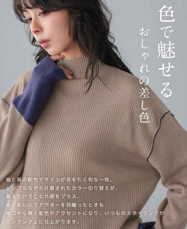 配色リブニットボトルネックセーター ボトルネック リブニット ニット レディース トップスリブ 配色 体型カバー 秋新作 秋冬【メール便不可】