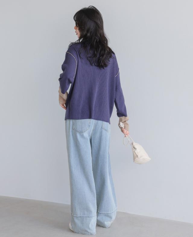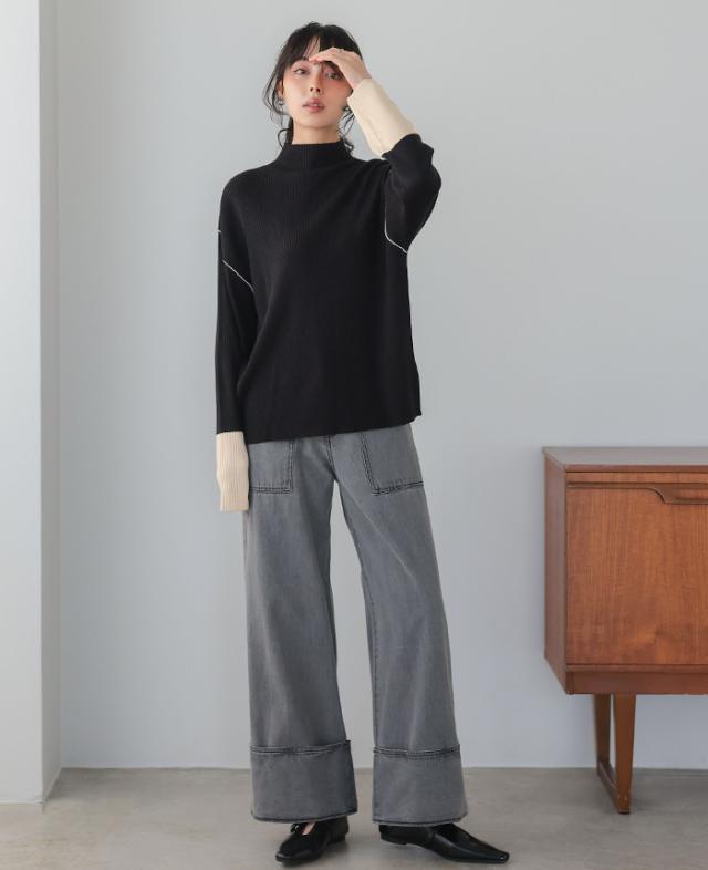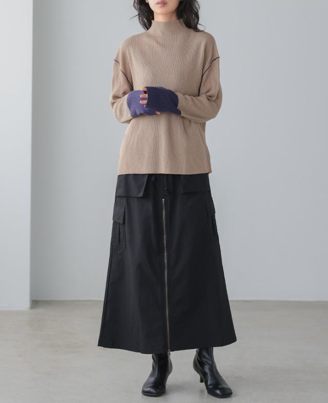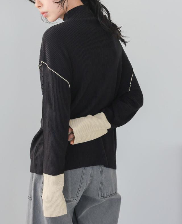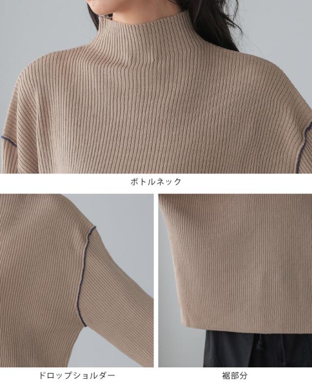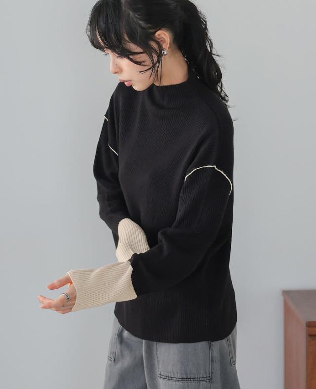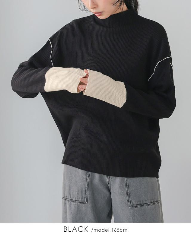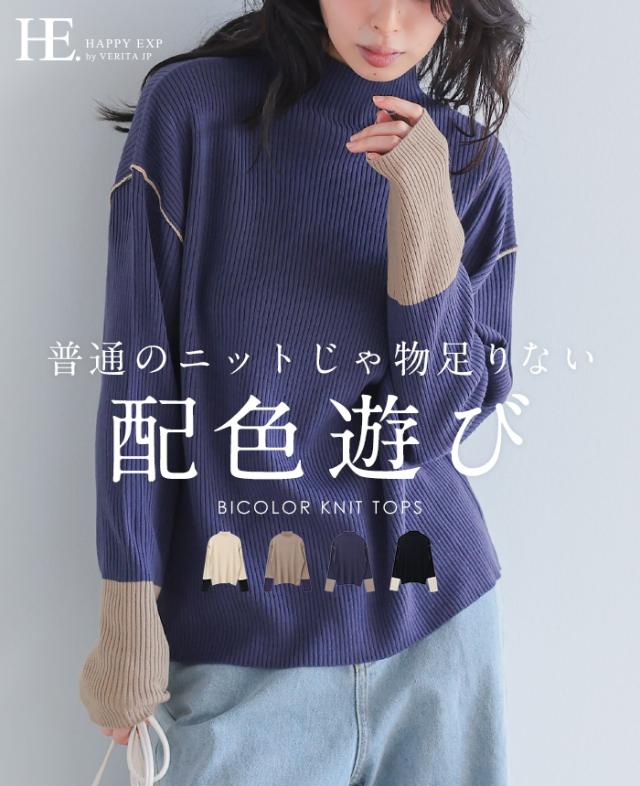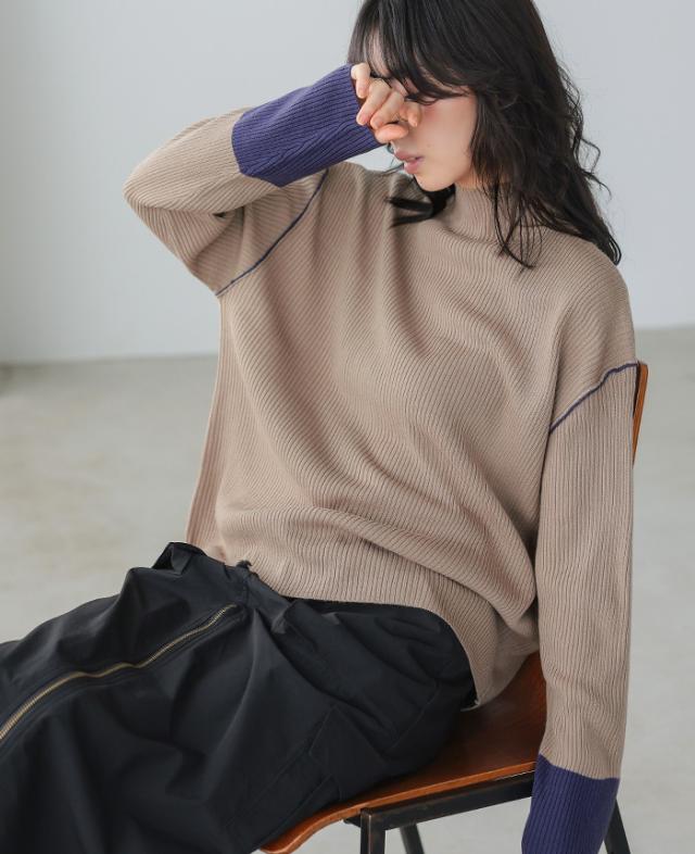 配色リブニットボトルネックセーター ボトルネック リブニット ニット レディース トップスリブ 配色 体型カバー 秋新作 秋冬【メール便不可】