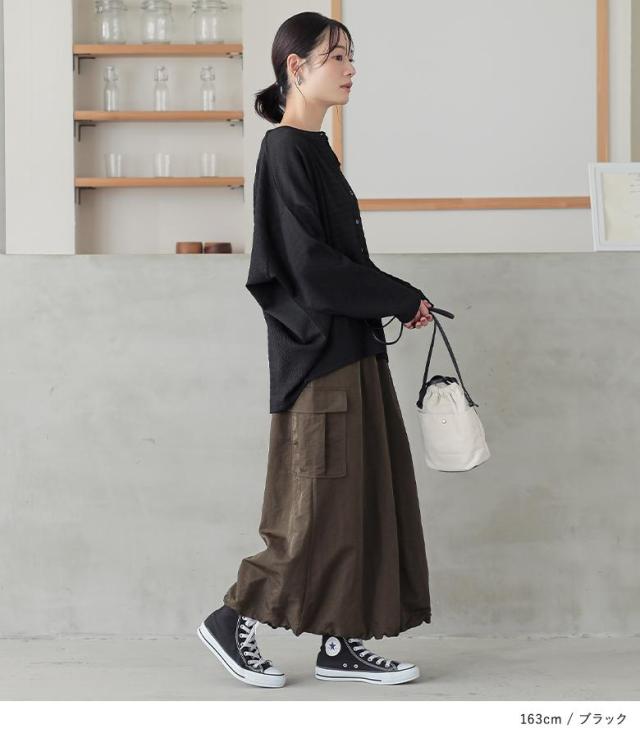 | staff:U/160cm B90 W75 H93 【普段着用】 Tops: M Bottoms: S/M | 【フリーサイズ】 袖丈:手の甲が隠れる位 着丈:ヒップ真ん中より下位 腕周り:大きい バスト:大きい 全体:ゆったり 全体的に体に沿わないゆとりのあるサイズ感です。 |