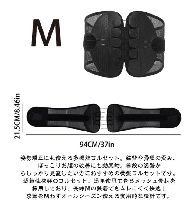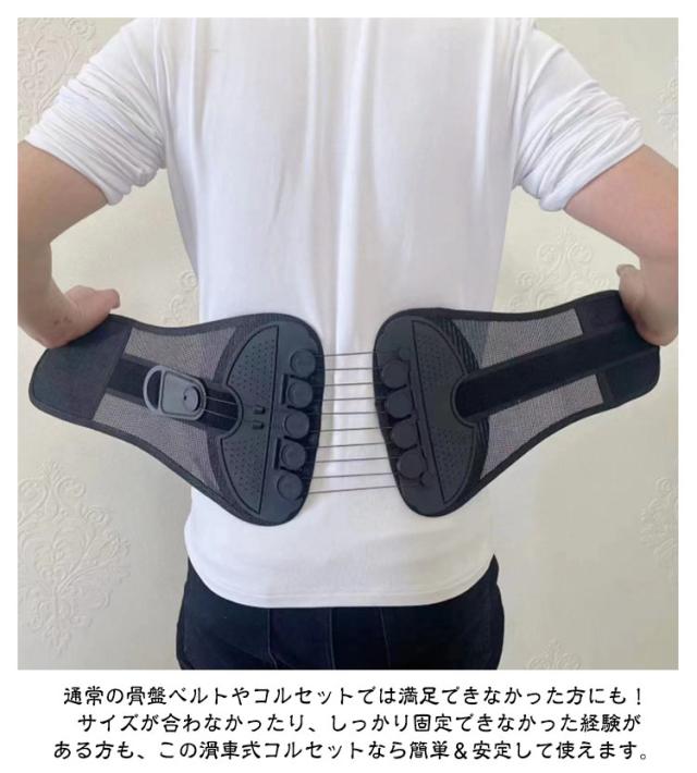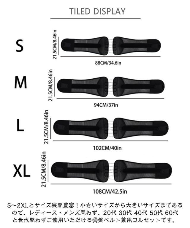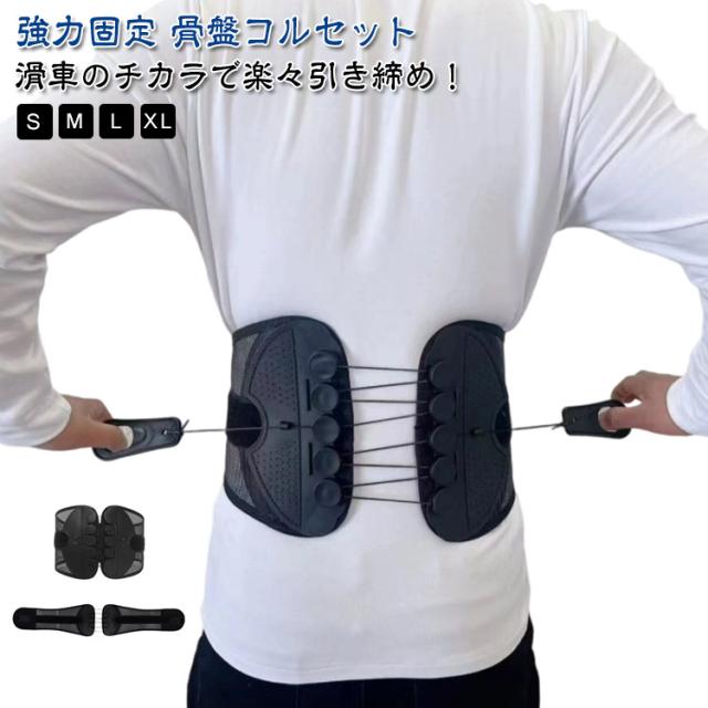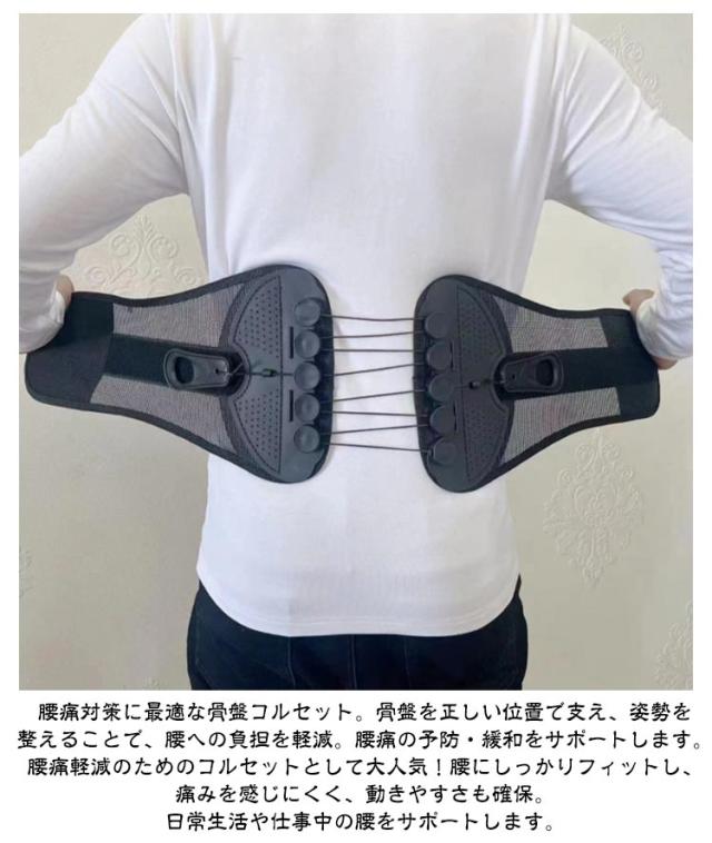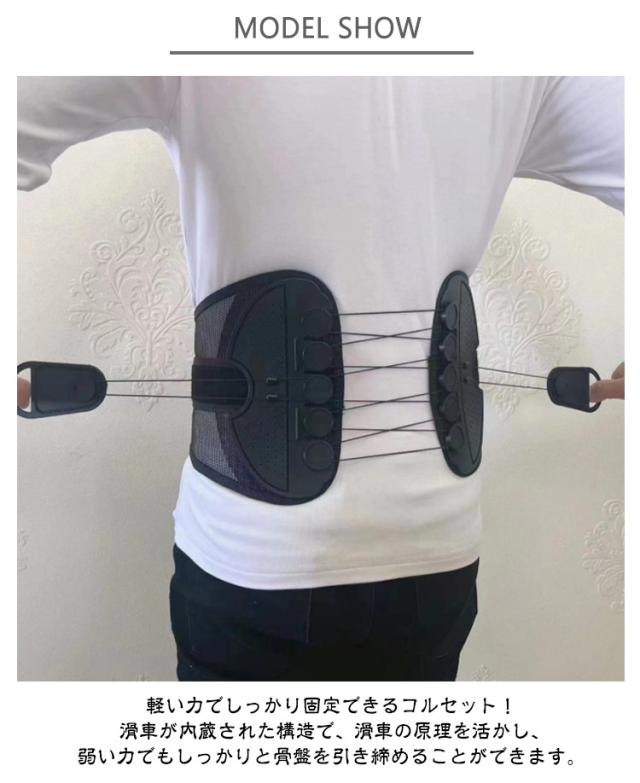 | 滑車のチカラで楽々引き締め!強力固定 骨盤コルセット 軽い力でしっかり固定できるコルセット! 滑車が内蔵された構造で、滑車の原理を活かし、弱い力でもしっかりと骨盤を引き締めることができます。 通常の骨盤ベルトやコルセットでは満足できなかった方にも! サイズが合わなかったり、しっかり固定できなかった経験がある方も、この滑車式コルセットなら簡単&安定して使えます。 腰痛対策に最適な骨盤コルセット。骨盤を正しい位置で支え、姿勢を整えることで、腰への負担を軽減。腰痛の予防・緩和をサポートします。 腰痛軽減のためのコルセットとして大人気!腰にしっかりフィットし、痛みを感じにくく、動きやすさも確保。日常生活や仕事中の腰をサポートします。 姿勢矯正にも使える多機能コルセット。猫背や骨盤の歪み、ぽっこりお腹の改善にも効果的。普段の姿勢からしっかり見直したい方におすすめの骨盤コルセットです。 通気性抜群のコルセット。通年使用できるメッシュ素材を採用しており、長時間の装着でもムレにくく快適!季節を問わずオールシーズン使える実用的な設計です。 着脱の難しいホックはなし!強力なマジックテープ仕様なので、簡単にしっかりと固定できます。 ホック不要のマジックテープ式コルセット!着脱が簡単で、誰でもラクに装着できます。しっかり固定できてズレにくいので、安心して使えます。 S〜2XLとサイズ展開豊富!小さいサイズから大きいサイズまであるので、レディース・メンズ問わず、20代 30代 40代 50代 60代と世代問わずご使用いただける骨盤ベルト兼用コルセットです。 腰痛が気になる方、猫背やぽっこりお腹が気になる方、姿勢の歪みが気になる方、むくみが気になる方、腰に負担がある作業をする方、産前産後の骨盤ケア、家事や仕事をしながら体型改善など…様々なシーンでご使用いただけます。 骨盤ベルトとコルセットのいいとこ取り!オフィスやリモートワークでデスクワークが多い方、おうち時間が多く座っている時間が長い方にもオススメです。 骨盤サポーターなのにガードルのような使用感!薄型設計の骨盤コルセットだから、洋服の下にも着用可能。まるでガードルのように使えて、体型補正やボディメイクにもぴったりです。 整体級のスッキリ感が得られるコルセット!自宅で手軽に骨盤ケアができ、猫背矯正・姿勢矯正・骨盤矯正のサポートに大活躍。 ダ | |