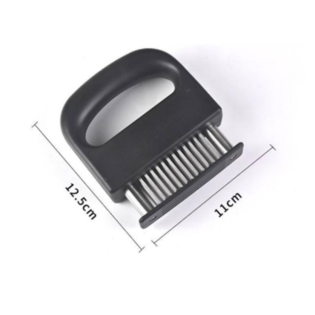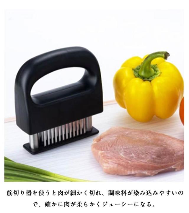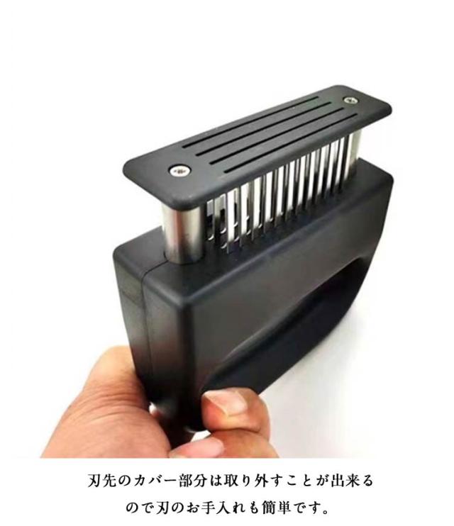 | 調理時間を短縮! お肉を簡単に柔らかくする魔法のツール! ステンレス刃を採用し、耐久性に優れている。 筋切り器を使うと肉が細かく切れ、調味料が染み込みやすいので、確かに肉が柔らかくジューシーになる。 特製の48本のステンレス刃が、風味、形を損なうことなくジューシーなお肉に大変身!。 グリップタイプなので、しっかりと握ることができるので扱いやすく便利です。 刃先のカバー部分は取り外すことが出来るので刃のお手入れも簡単です。 牛、豚、羊、鶏等あらゆるお肉のステーキ、焼肉、カツ、シチュー、その他様々な料理にご使用いただけます。 | |