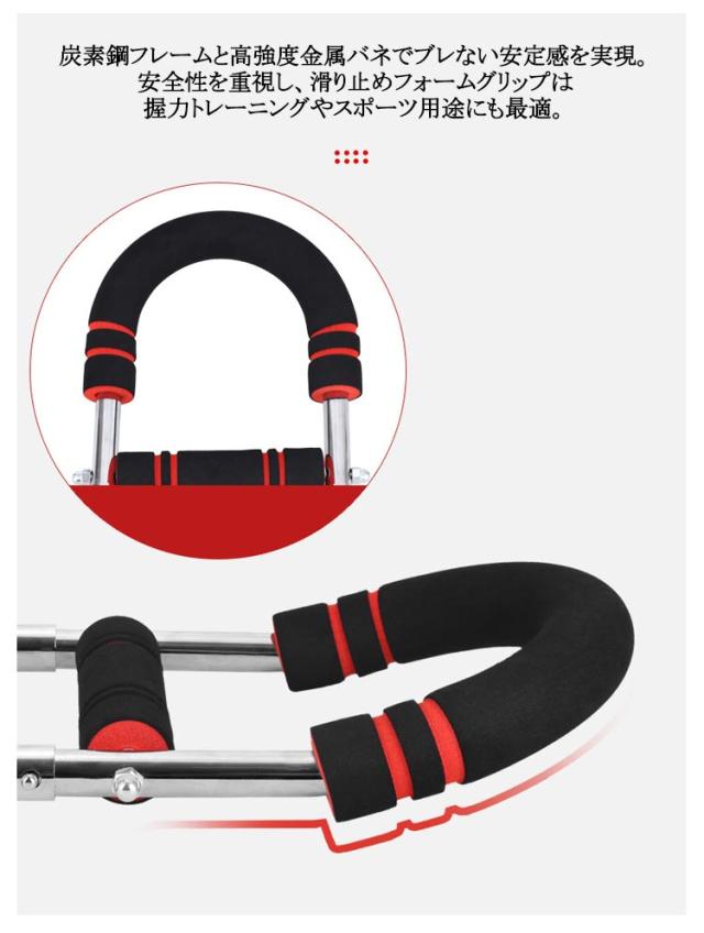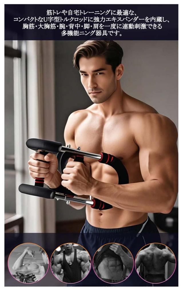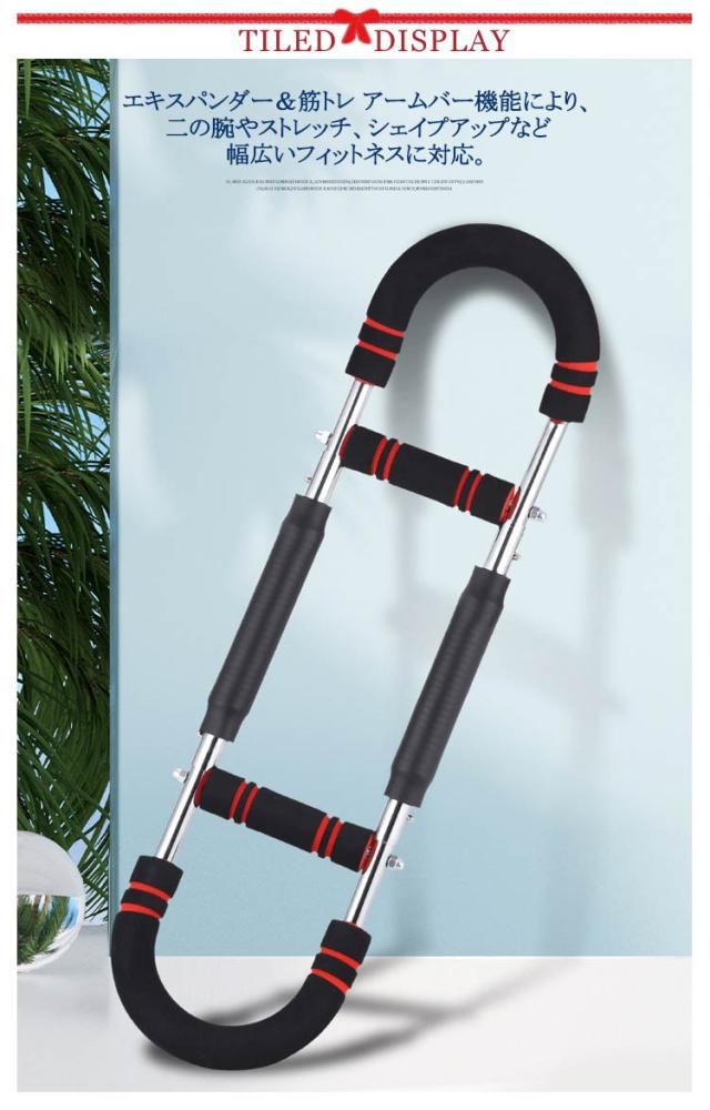 | 【U字型デザイン】【3段階負荷切替式筋トレ アームバー】 エキスパンダー&筋トレ アームバー機能により、二の腕やストレッチ、シェイプアップなど幅広いフィットネスに対応。 筋トレや自宅トレーニングに最適な、コンパクトなU字型トルクロッドに強力エキスパンダーを内蔵し、胸筋・大胸筋・腕・背中・脚・肩を一度に連動刺激できる多機能ニング器具です。 調節可能なグリップ位置を上下にスライドさせるだけで30kg/40kg/50kgの3モードに瞬時切替。 エキスパンダー式の可変抵抗が筋繊維をしっかり追い込み、短時間で全身を効率的に鍛え上げます。 分解・組立がワンタッチで可能なシンプル構造。コンパクトかつ多機能な家庭用トレーニンググッズとして、リビング、オフィス、旅先でもサッと取り出して使えます。 炭素鋼フレームと高強度金属バネでブレない安定感を実現。安全性を重視し、滑り止めフォームグリップは握力トレーニングやスポーツ用途にも最適。 | |