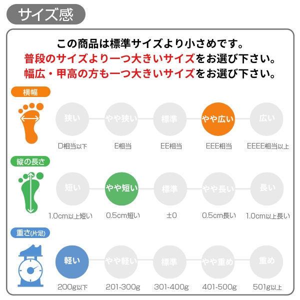 甲高、幅広の方→「ワンサイズ大きいサイズ」
