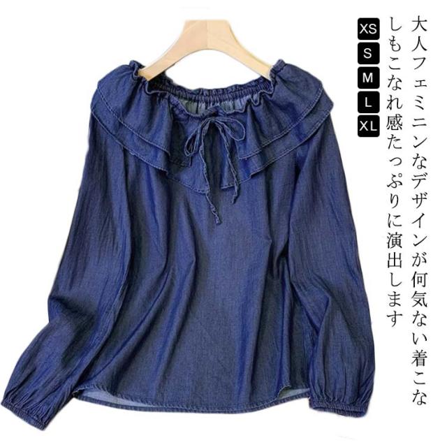 カジュアル デニムシャツ ブラウス トップス シャツ レディースシャツ秋 フリル襟 秋シャツ 長袖ブラウス ブルー 春 秋 レディース デニムブラウス デニム ブルゾン ゆったり 通学 カジュアル お出かけ 春秋物 着痩せ